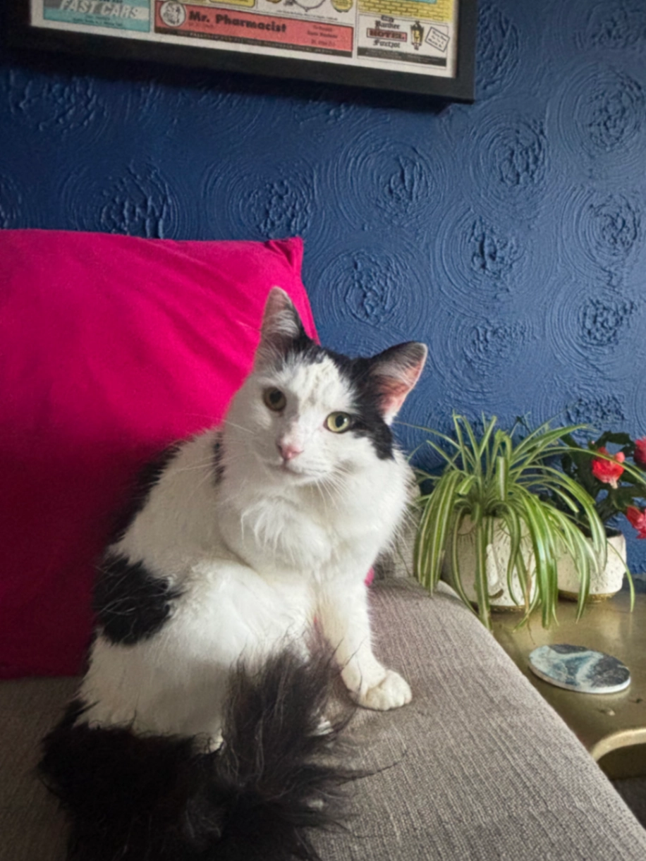 Long haired cat with very bushy black tail. Friendly little boy