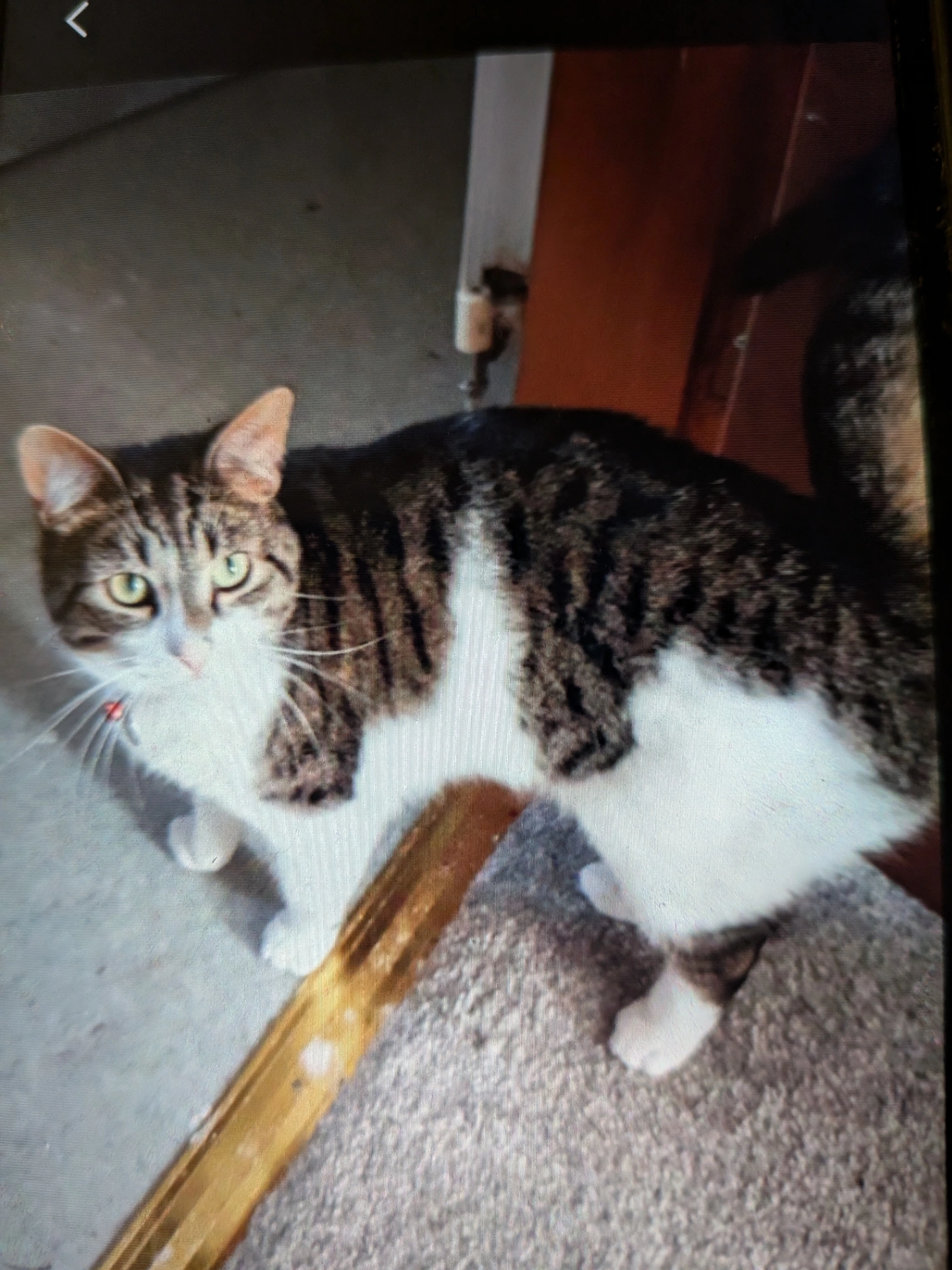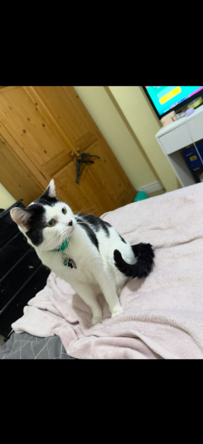 Mochi is 1 years old, is a British short hair and is black and white, he had a green collar with a tag around his neck last time I saw time.