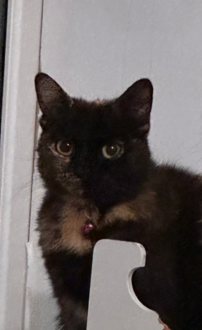 Black domestic shorthair. Tuxedo. Recently had a cut on his tale.