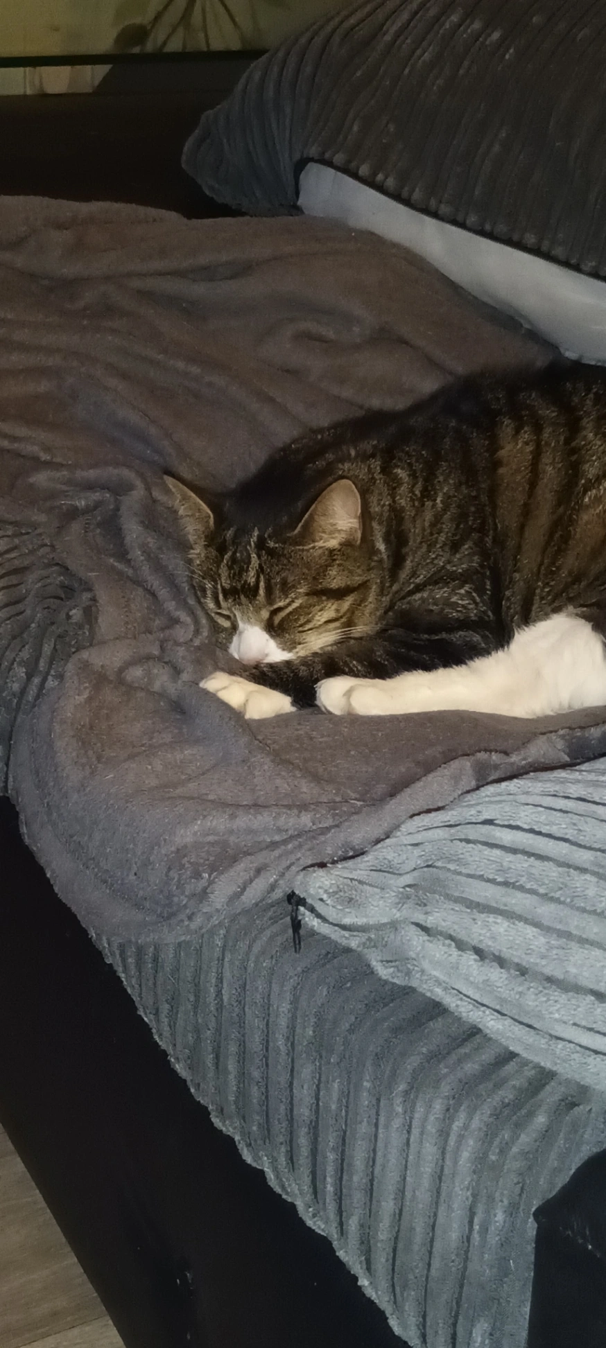 Very friendly cat we are missing him 1x black eye and tail and 2 black blobs on his side