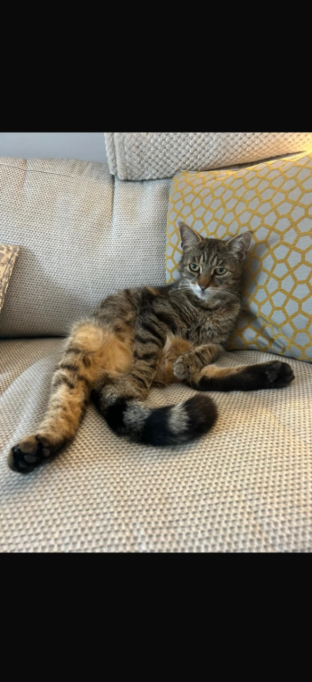 She’s a female tabby, around 6 months old, skinny, has been neutered and microchipped, part of her fur has been shaved off