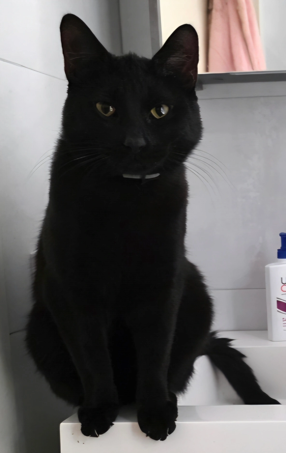 Zwart kitten met okergele ogen. 2 witte haartjes op zijn koppie. Miauwt heel zacht. Geen halsband, wel gechipt en gecastreerd