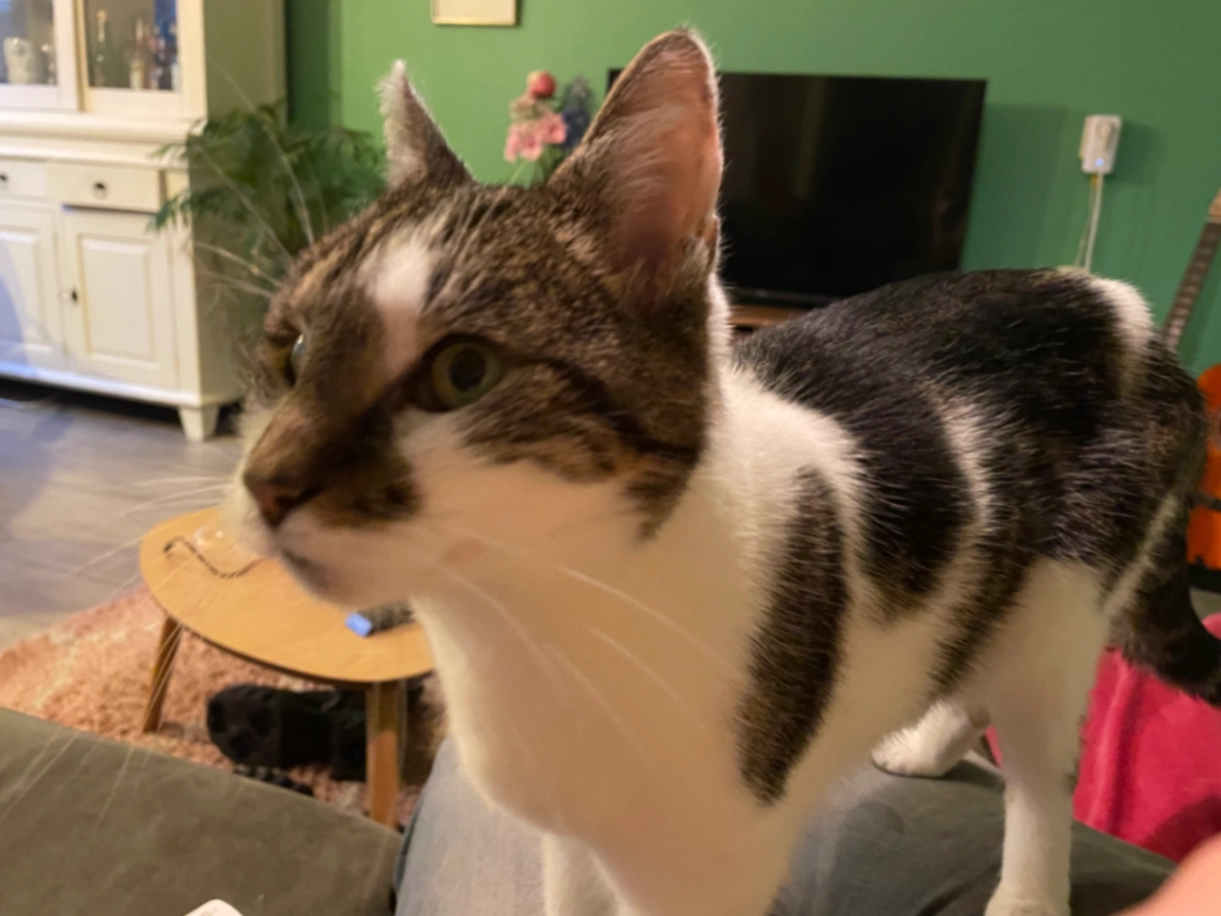 Reageert slecht op zijn naam, lief naar mensen toe. Op het moment dat die vermist raakte erg verkouden