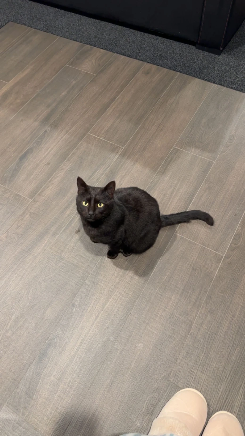 Black cat with some white hairs and a little chonky, very friendly once you call his name and bend down to his level to pat him