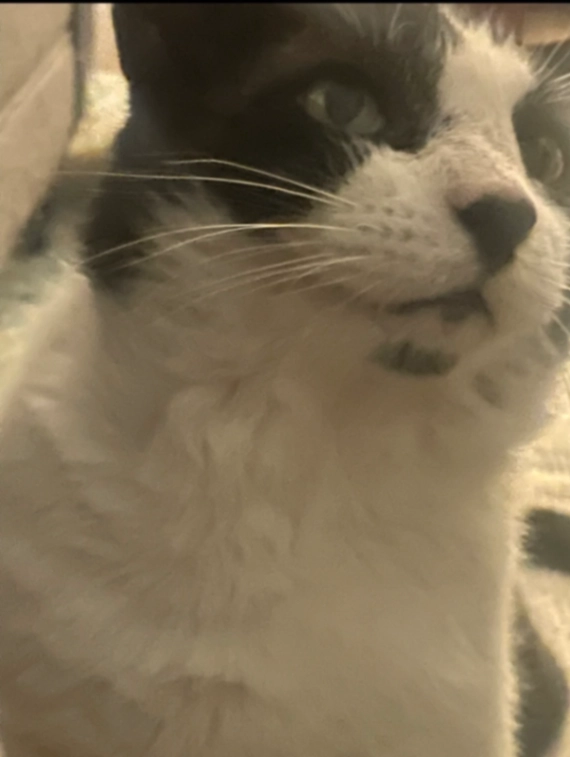 Black and white adult male cat, not fixed, green eyes, black nose, black dot on chin. Friendly but probably scared.