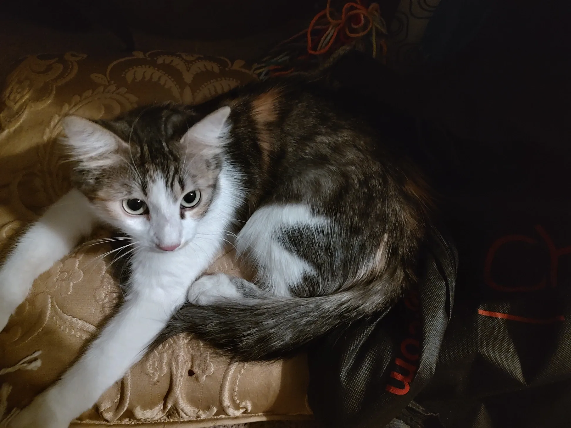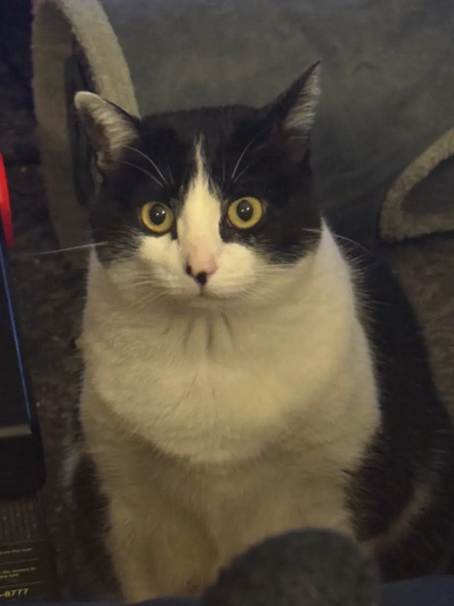 Female, black and white tuxedo with green eyes. Has white paws/legs with black patches on her hind legs; pink nose with black spots; her right ear has a white tip; and black tail.