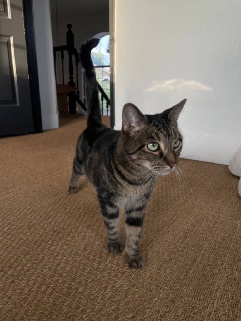 Shy but sweet indoor-only 9 yo female. Short haired brown/gray tabby with tan belly and blue spay tattoo. No collar, tags, or microchip, went missing from someone else’s home in an unfamiliar area so will likely be scared/hiding. Not very vocal and has asthma so may be sneezing or breathing quickly w/o inhaler. Treat motivated but also smart, DO NOT CHASE/FOLLOW. Contact ASAP so I know where to refocus our efforts and get her back as quickly as possible. 💕