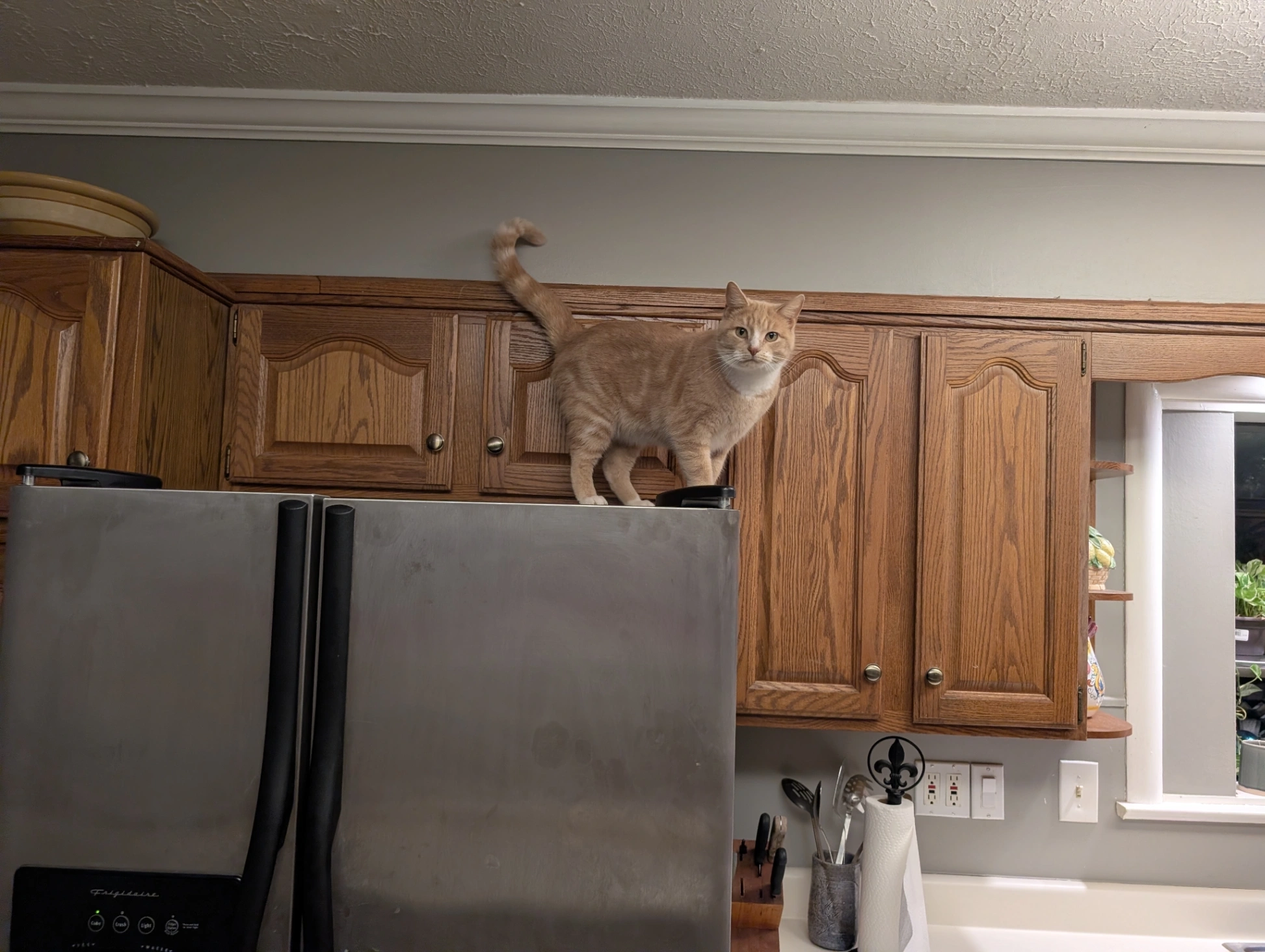 Highly outgoing young orange tabby. He will wrap around your ankles and ask for affection. He has a microchip.