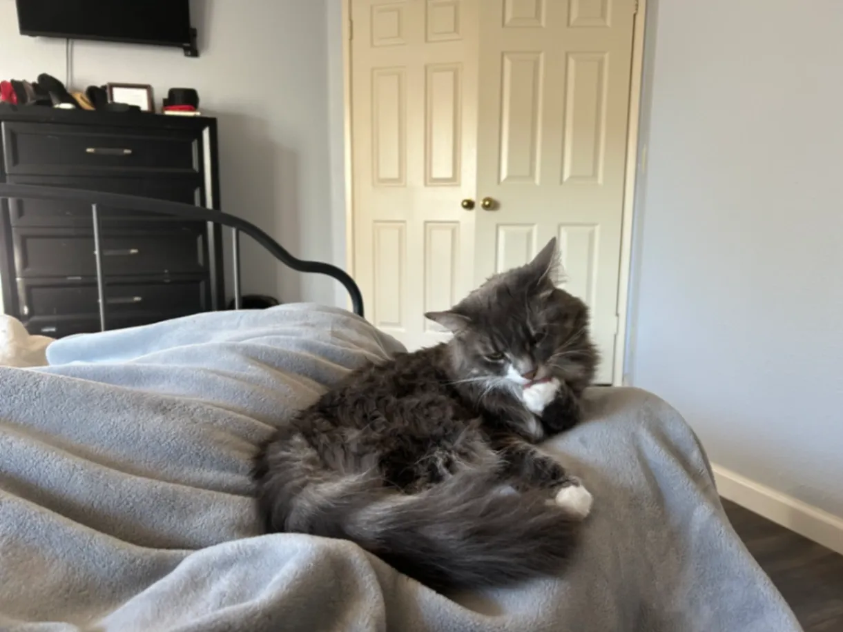 Small, furry grey cat. Likely in the woods behind Contignac Dr, Murrieta, CA