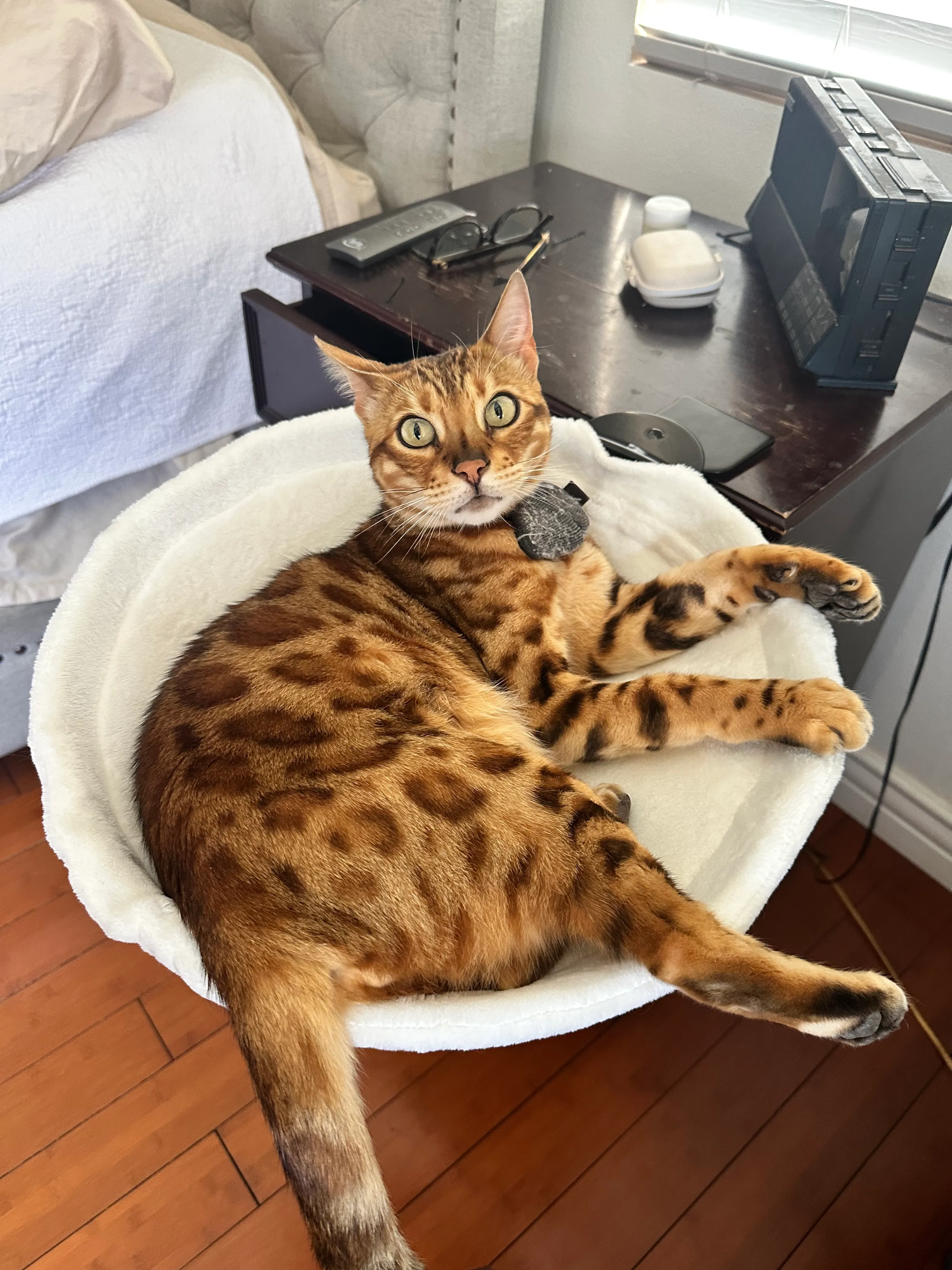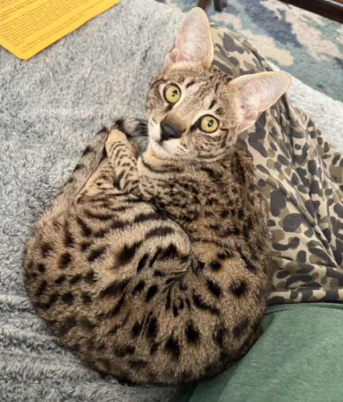 2 year old female Savannah Cat missing. She has a slender body and long legs.. She is tan with black spots and stripes on her face, legs and tail. Last seen near Whitewood and Clinton Keith in Murrieta