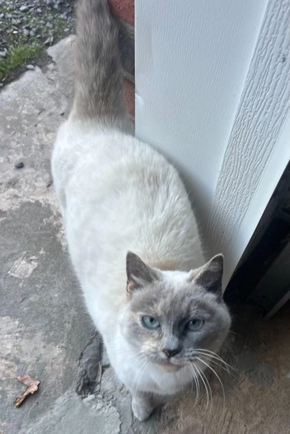 White fur, blue eyes, greyish face and tail. No collar.
