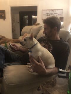 He’s a friendly, sweet white and black chihuahua with big ears. He is very quick and skiddish.