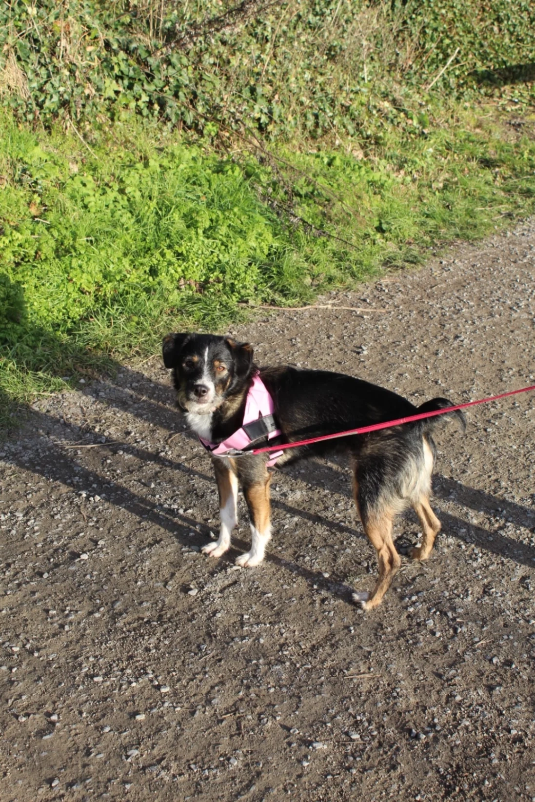 Heeft een snorretje, gechipt en draagt een roze halsband