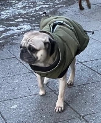 Scheuer, beiger Mopsrüde. Trägt eine Dunkelgrüne Steppjacke. Leicht graue schnauze