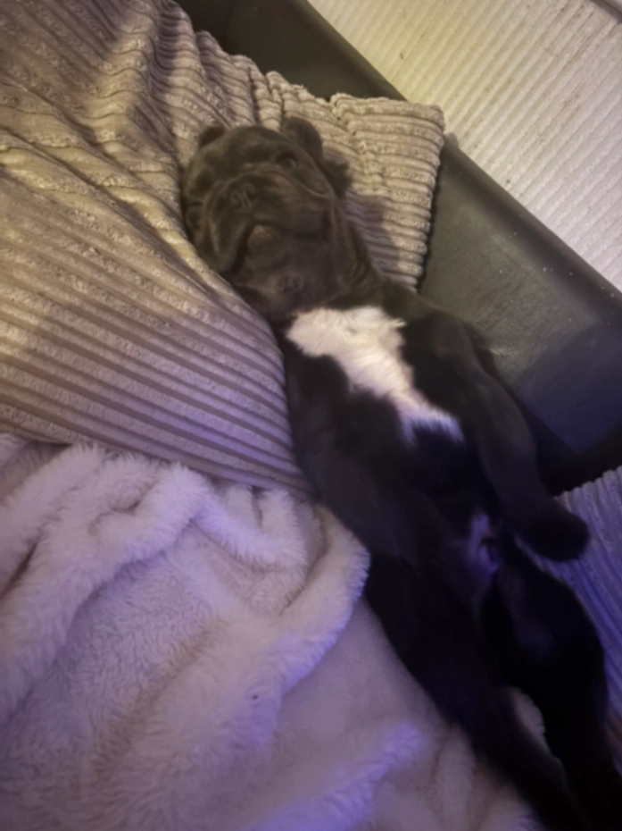 Small fluffy carrier french bulldog white patch on chest blue eyes fluffy ears black/blue-ish fur male roughly around 5/6 months old.