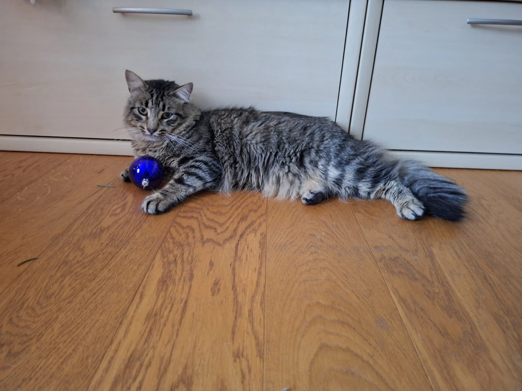 Kiki ist scheu, trägt ein graues Halsband und hat einen buschigen Schwanz. Er kann nicht miauen und auch nicht gut springen. Er hat Epilepsie und benötigt regelmäßig Medikamente.