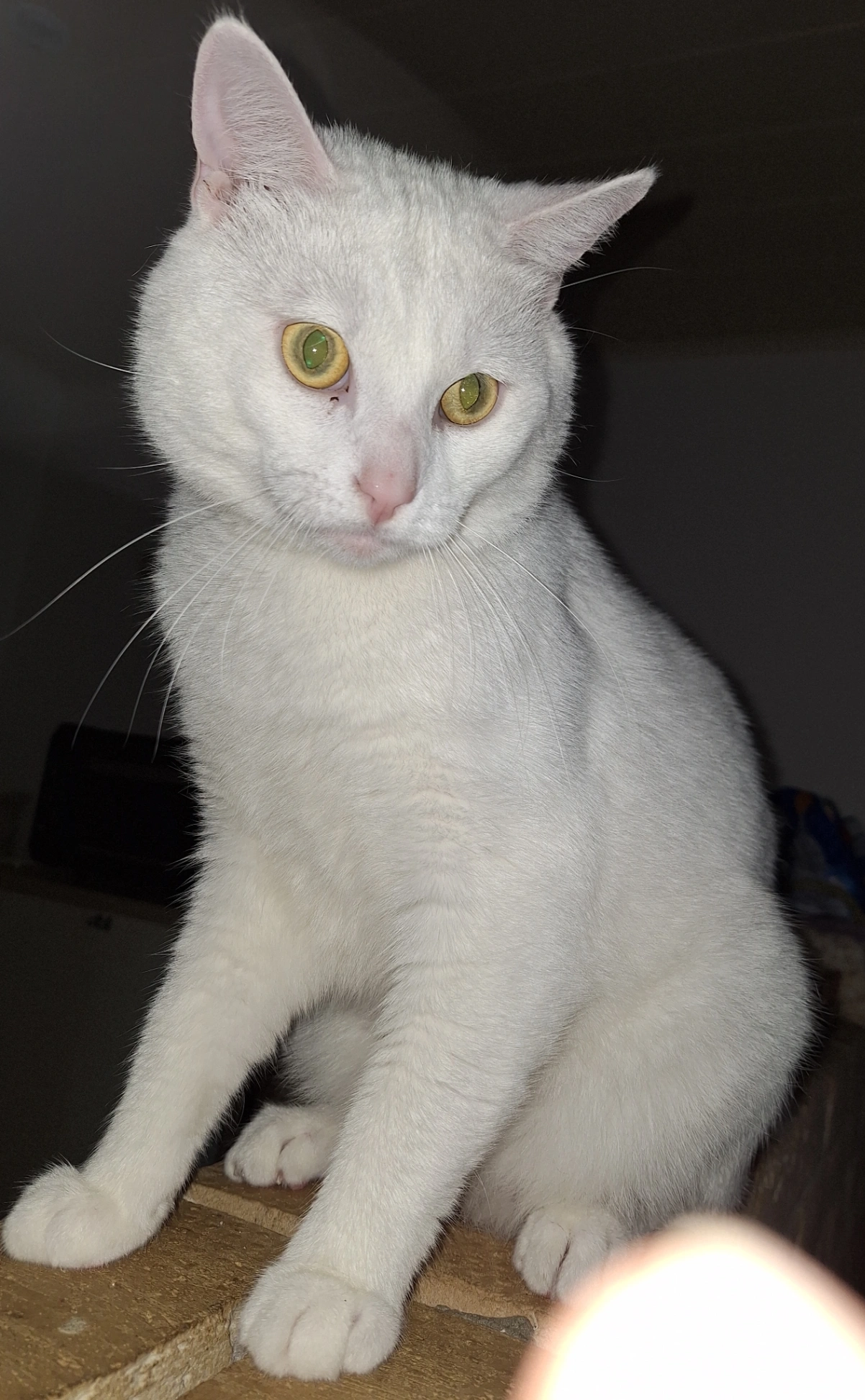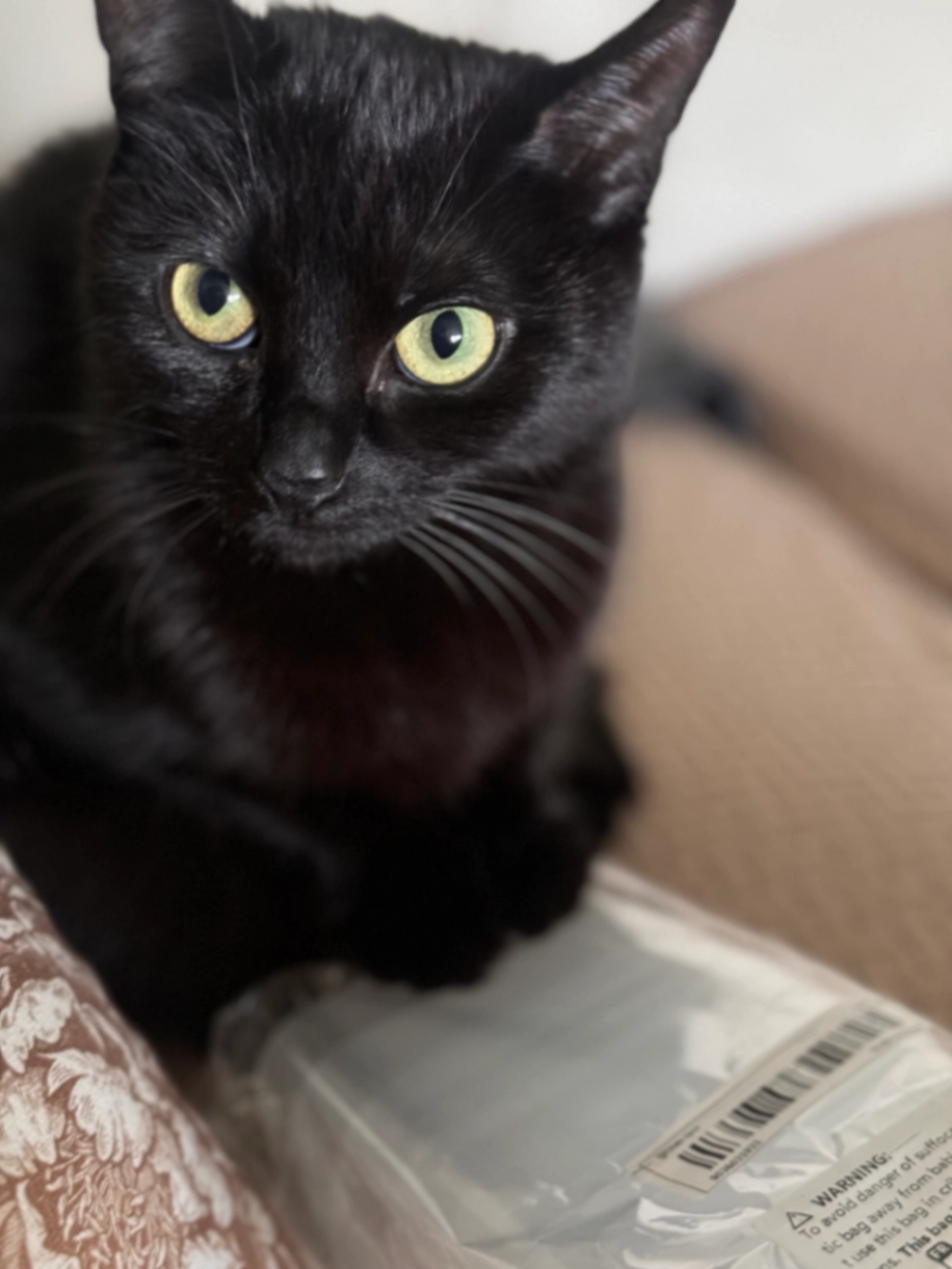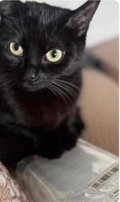 Zwarte kat, vrouwelijk, 3 jaar, met gele ogen, zeer schuw, gechipt en gesteriliseerd.