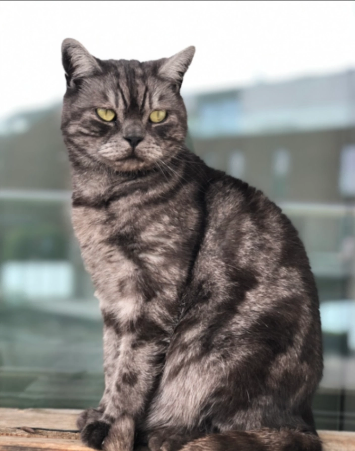 Grijze Britse korthaar, oude sociale kater die waarschijnlijk de weg is kwijtgeraakt