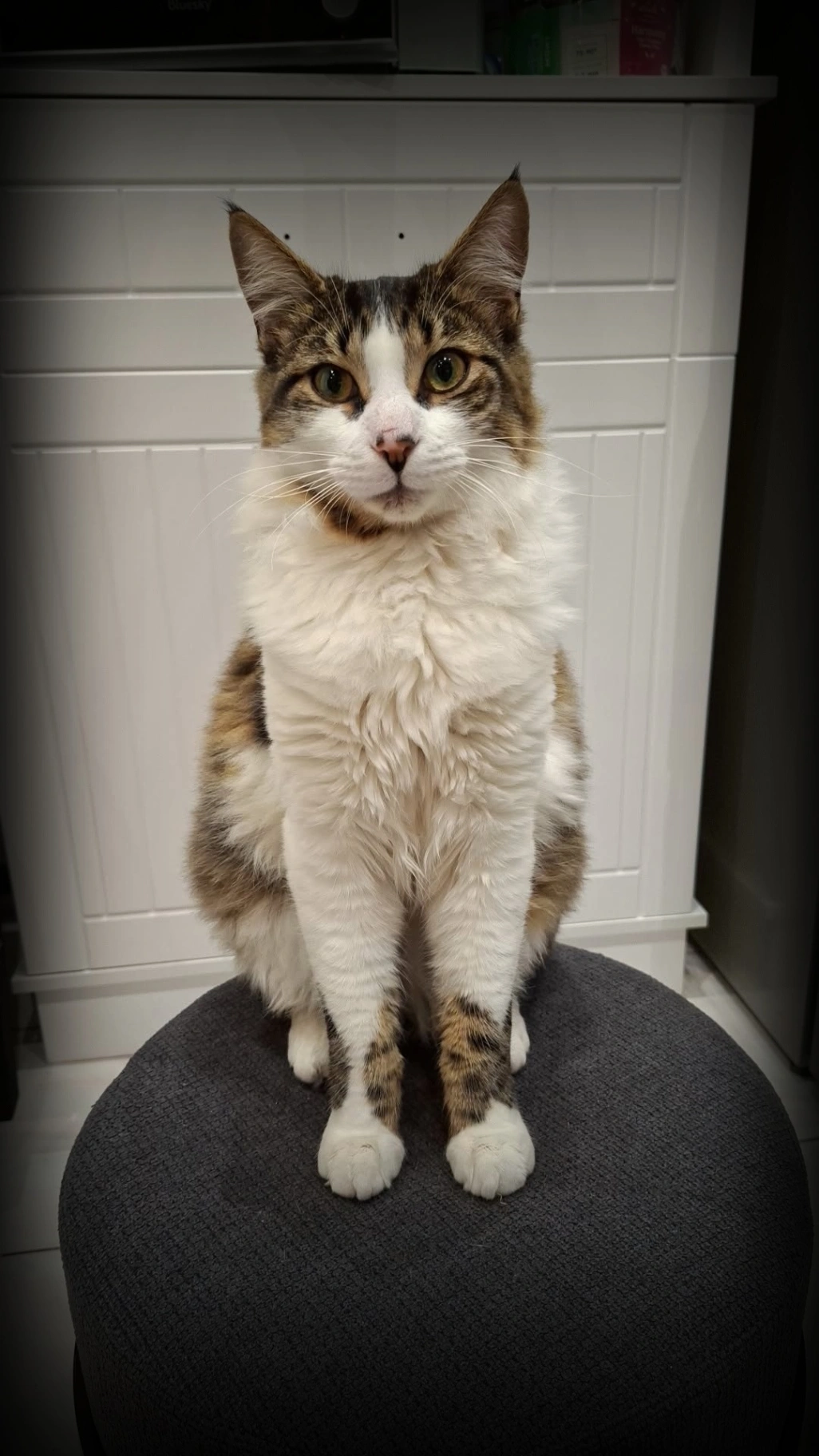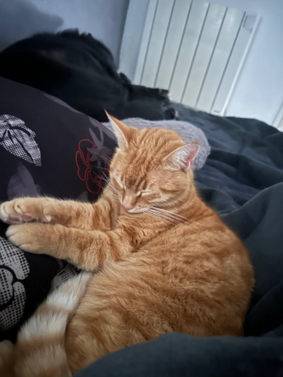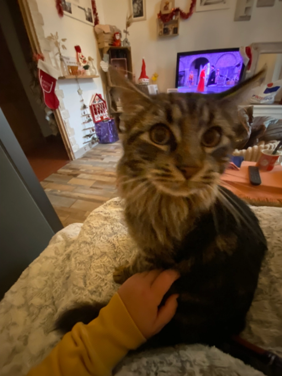 Il est moitié maîncoon et moitié gouttière. Il a une très longue queue. Il répond à son nom.