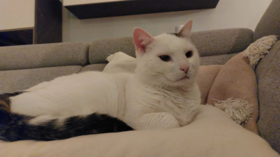 Hij is wit en heeft een zwarte staart met een wit puntje. Heeft een zwart vlekje boven zijn linker oog, bij het oor.