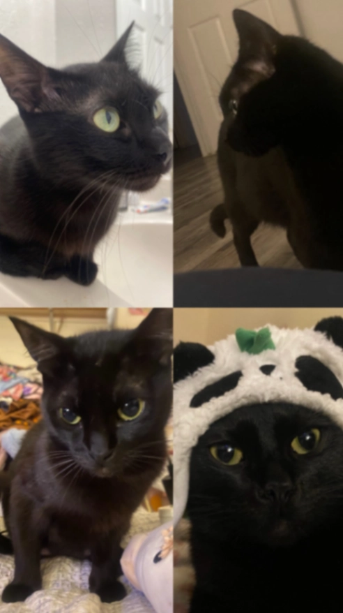 Black cat with narrow nose, kinda chubby with little pouch hanging, and his tail is slightly bent at the end! If u touch his tail u should be able to feel what i mean!