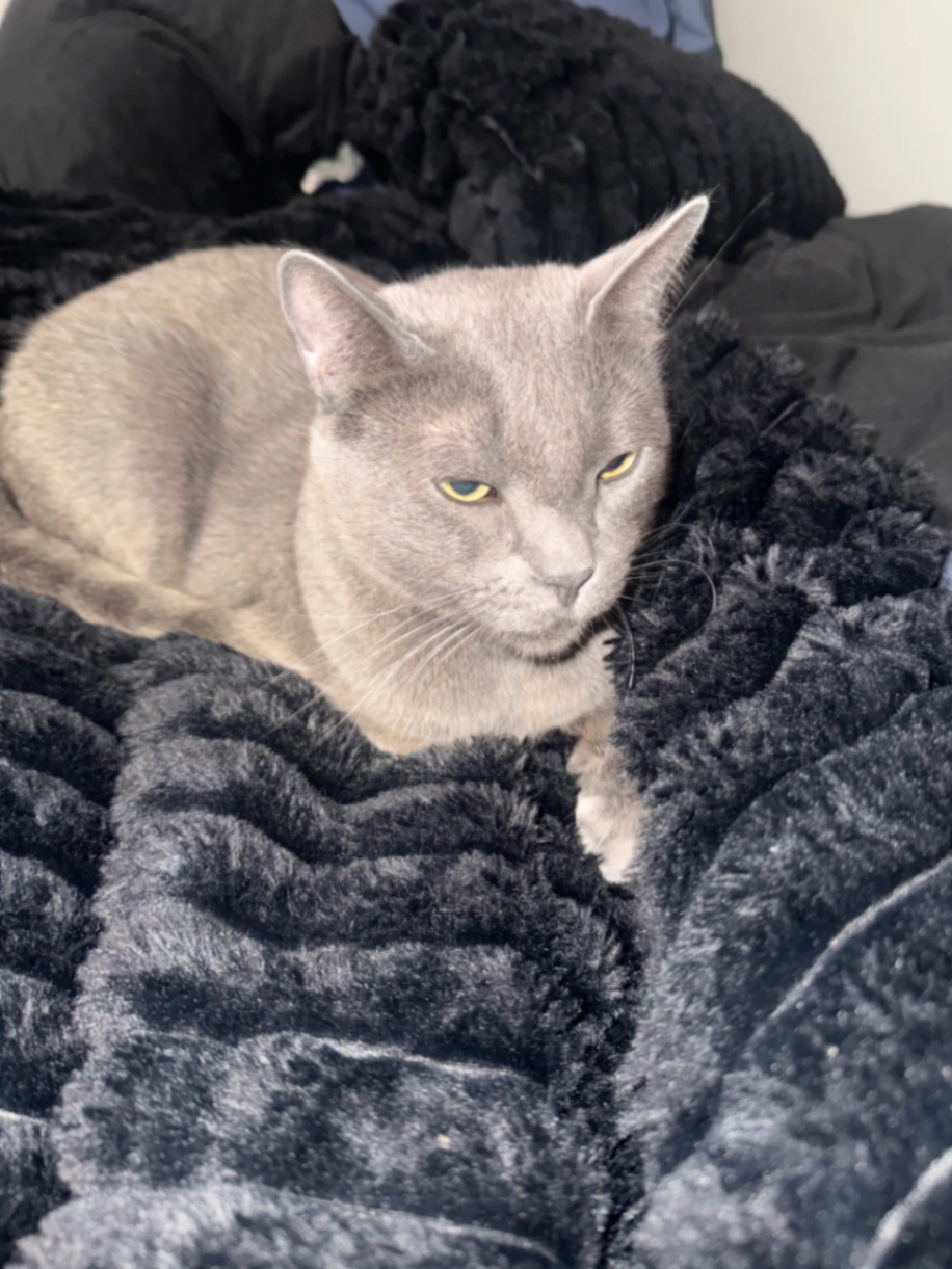 Solid gray with white mark on chest. Missing a toe on front paw. Extremely friendly shows no signs of aggression
