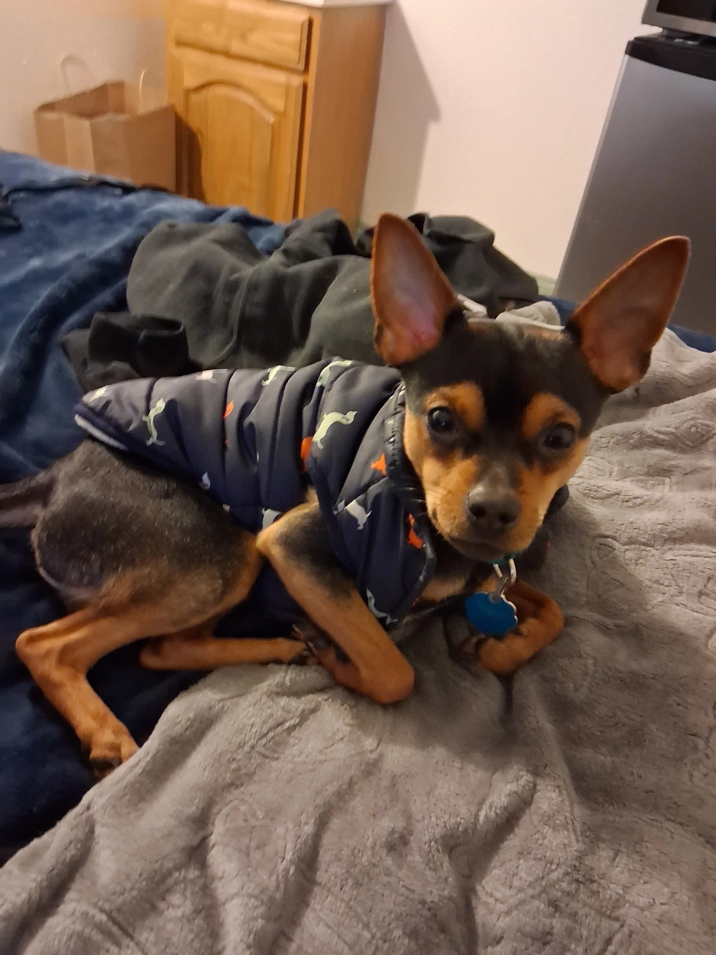 Yes he's black and brown he is mini pin and Jack Russell and he is skittish of people but mine with other dogs please he's a life of me if you find him please get back to me