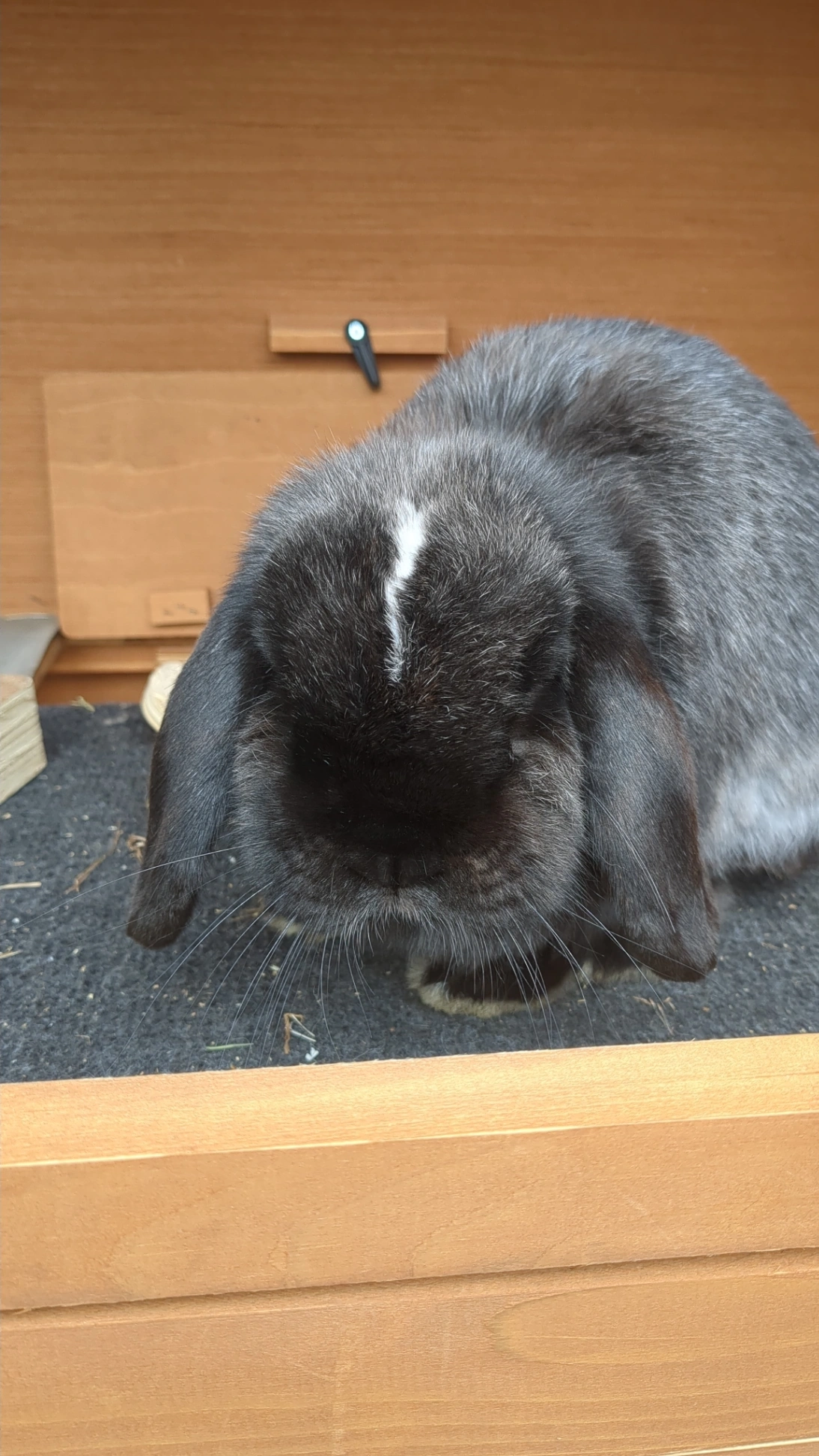 She is a 5 year old female rabbit. Black fur with a white stripe on her forehead