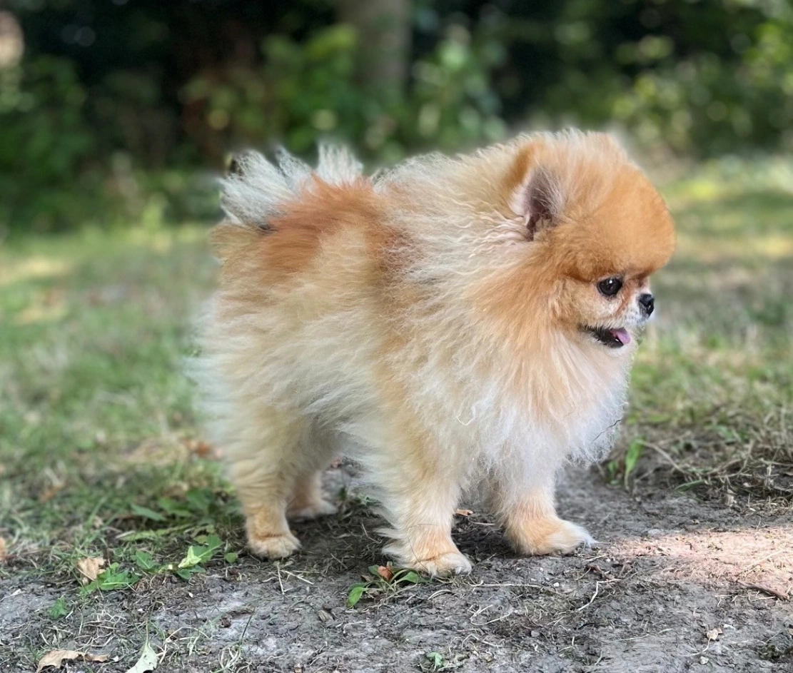 Klein mini Pomeriaantje, bijna 6 jaar oud. Bruin, plat snuitje, kleine 2 kg. Schuw, wat wantrouwend, vrolijk