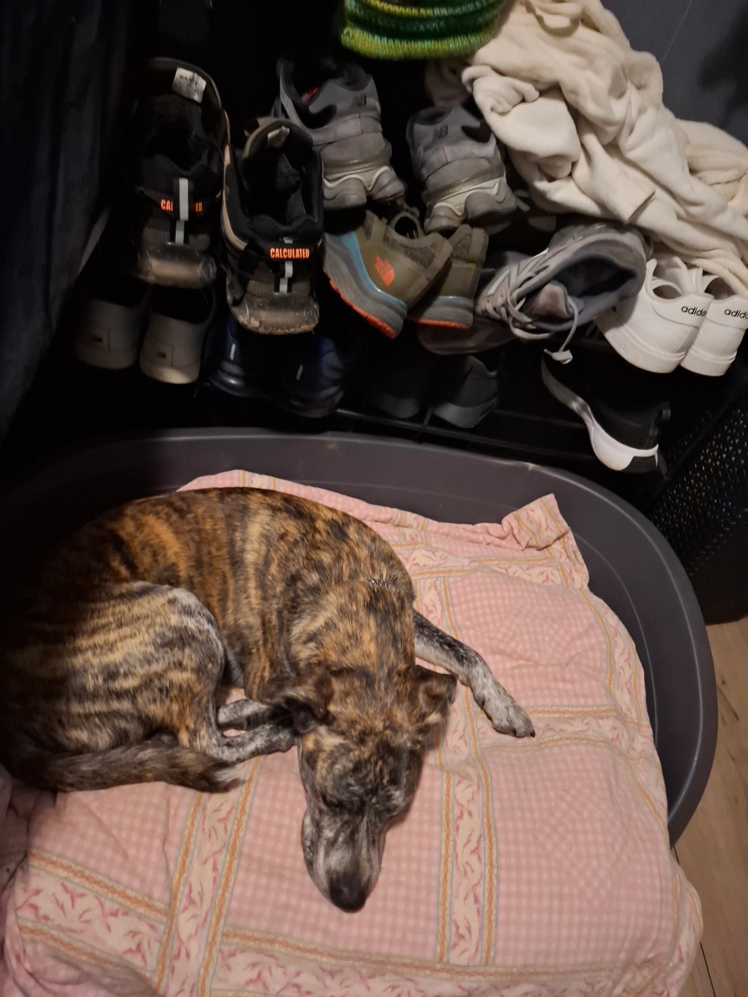 Hij komt uit Italië. Hij is bruin met zwarte vlekken, middelgroot, en heeft iets van een Stafford in zich. Superlief. Misschien een tikje angstig soms. Maar als je ‘Bonky’ roept, komt hij meteen