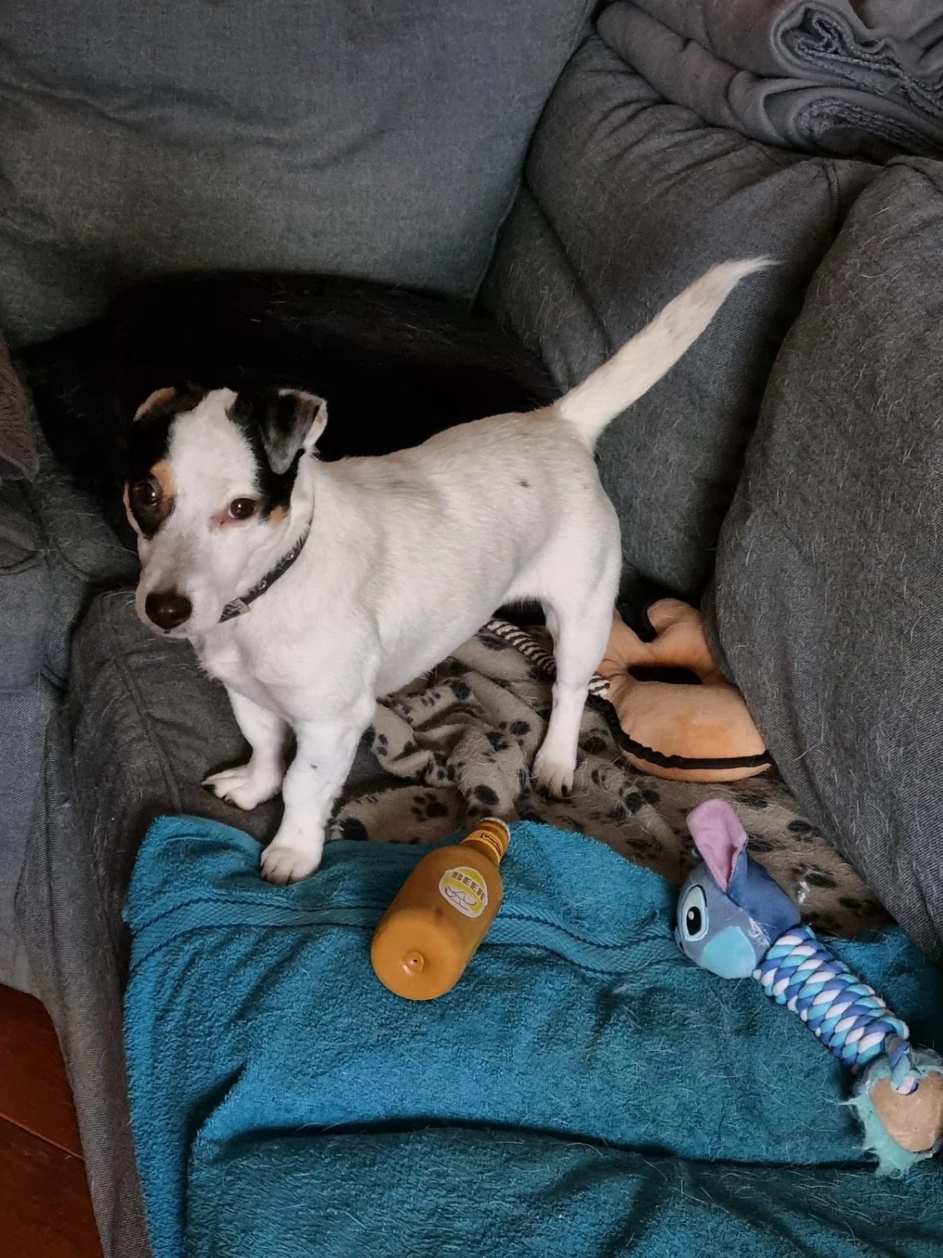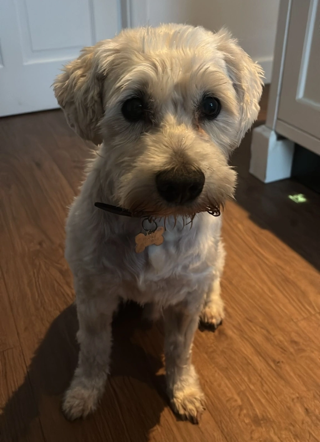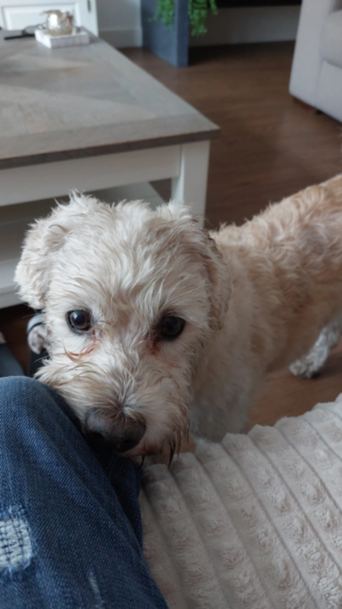 Rocky is blonde boomer Malteser+Tibetaanse terr. Met n pluimstaartje.Hij is 11 jaar en heeft neuroklachten.Hierdoor hoort hij het niet meer goed en reageert niet meer goed. Hij kan ook weg oversteken zonder te kijken. Of gaan rennen. Als hij bang is kan hij licht grommen of blaffen of met staartje naar beneden.Verder is hij nog wel nieuwsgiering en speels. Hij loopt kleine stukken en slaapt veel. Hij liep ineens weg na uitlaten,toen het riempje afging. Op zijn badge staan telnrs. Hij is gechipt.