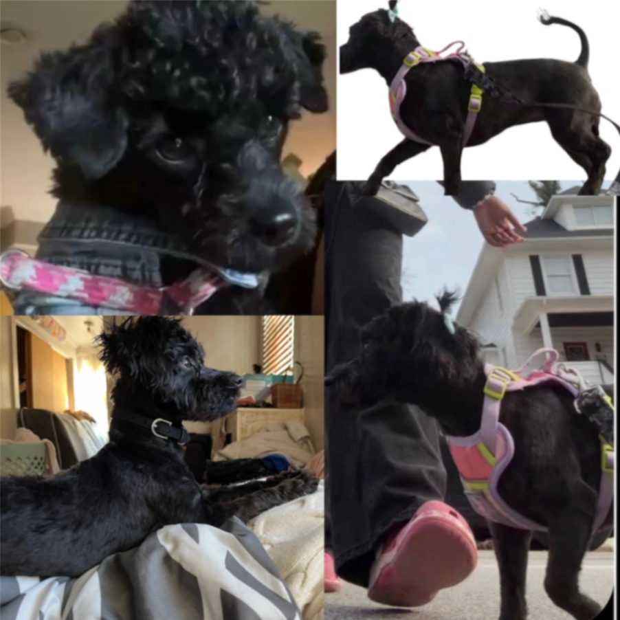 All black toy poodle. Medium cut fur. $10,000 reward for safe return, that is not a joke. Very motivated for her safe return. She is an emotional support animal.