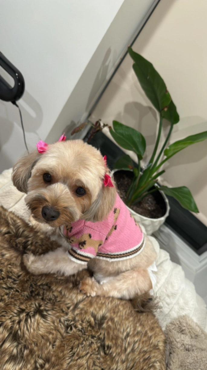 She was wearing a pick sweater and bows