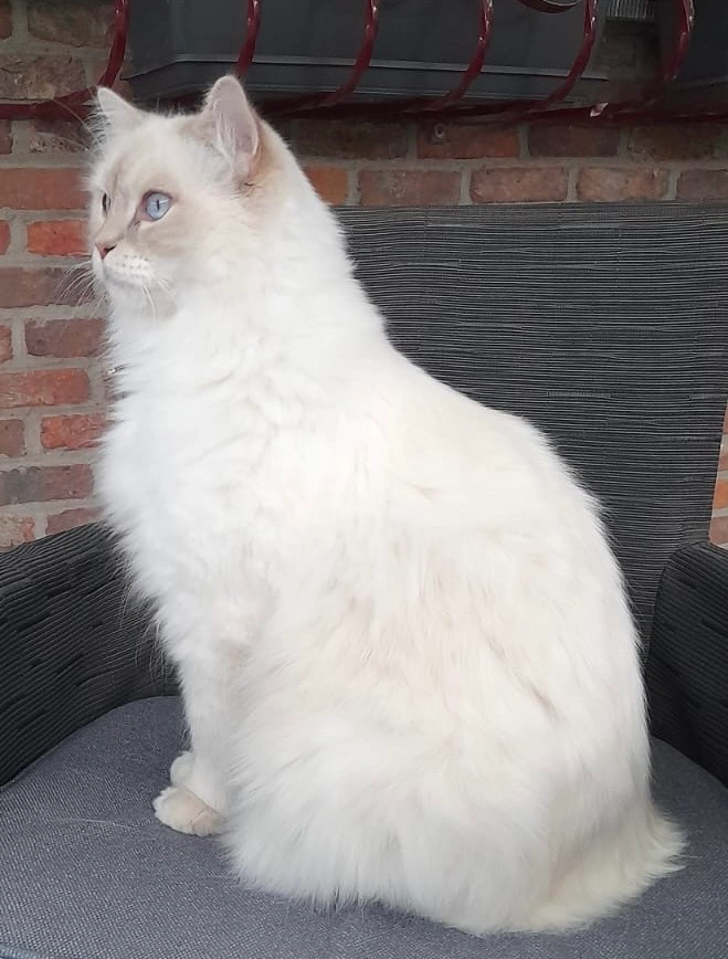 Kater, wit, gecastreerd, 7,5kg, bruinige oortjes, pootjes en neus ook licht bruin, blauwe ogen, gechipt, zachte lange haar, dikke pluche staart, zacht van karakter, bang van hard lawaai en plotse bewegingen