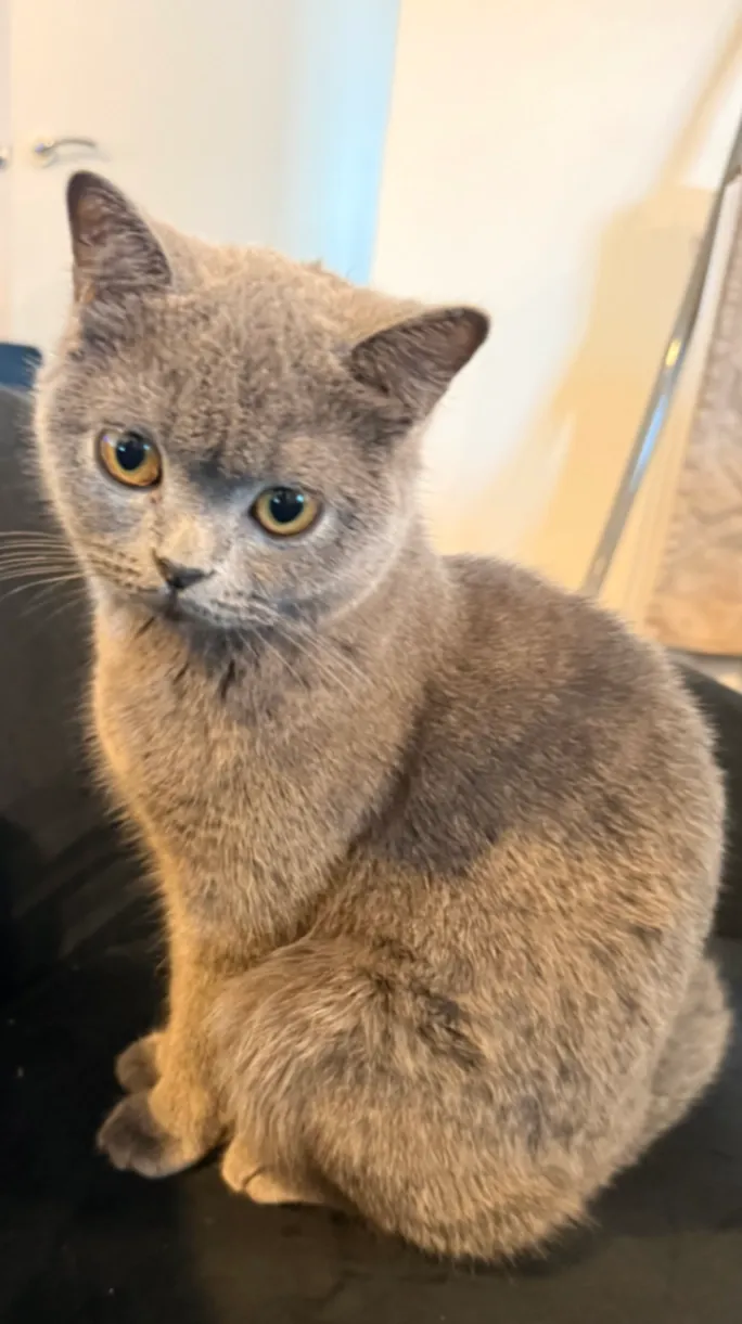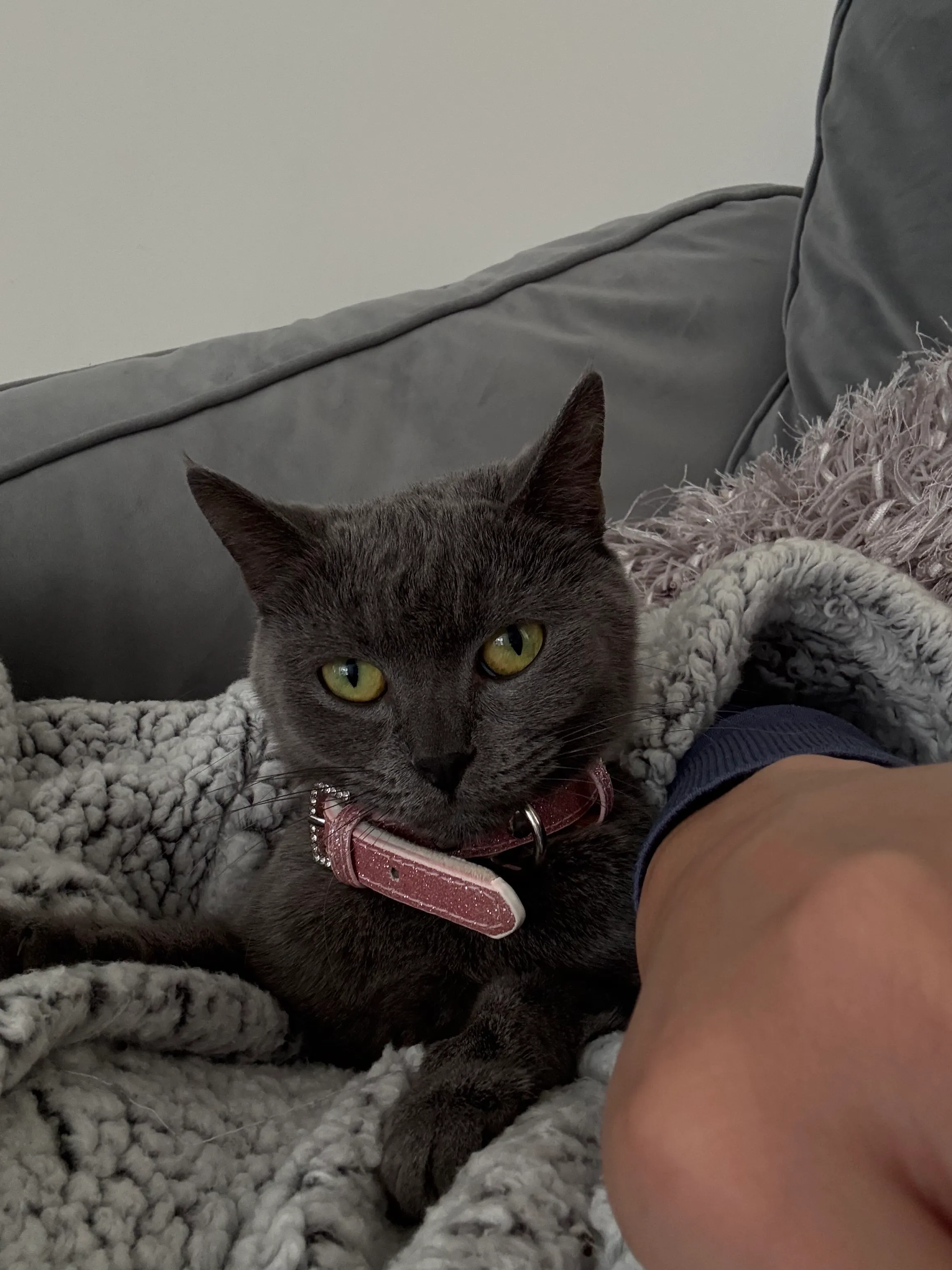 Tirana is a British short hair house cat. She is 7 months old. She is get in colour and very placid. She does not have a collar on her.