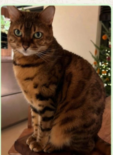Langharige bruine kat met een wit/geel baardje en een kenmerkende geel vlekje rond één van de ogen.