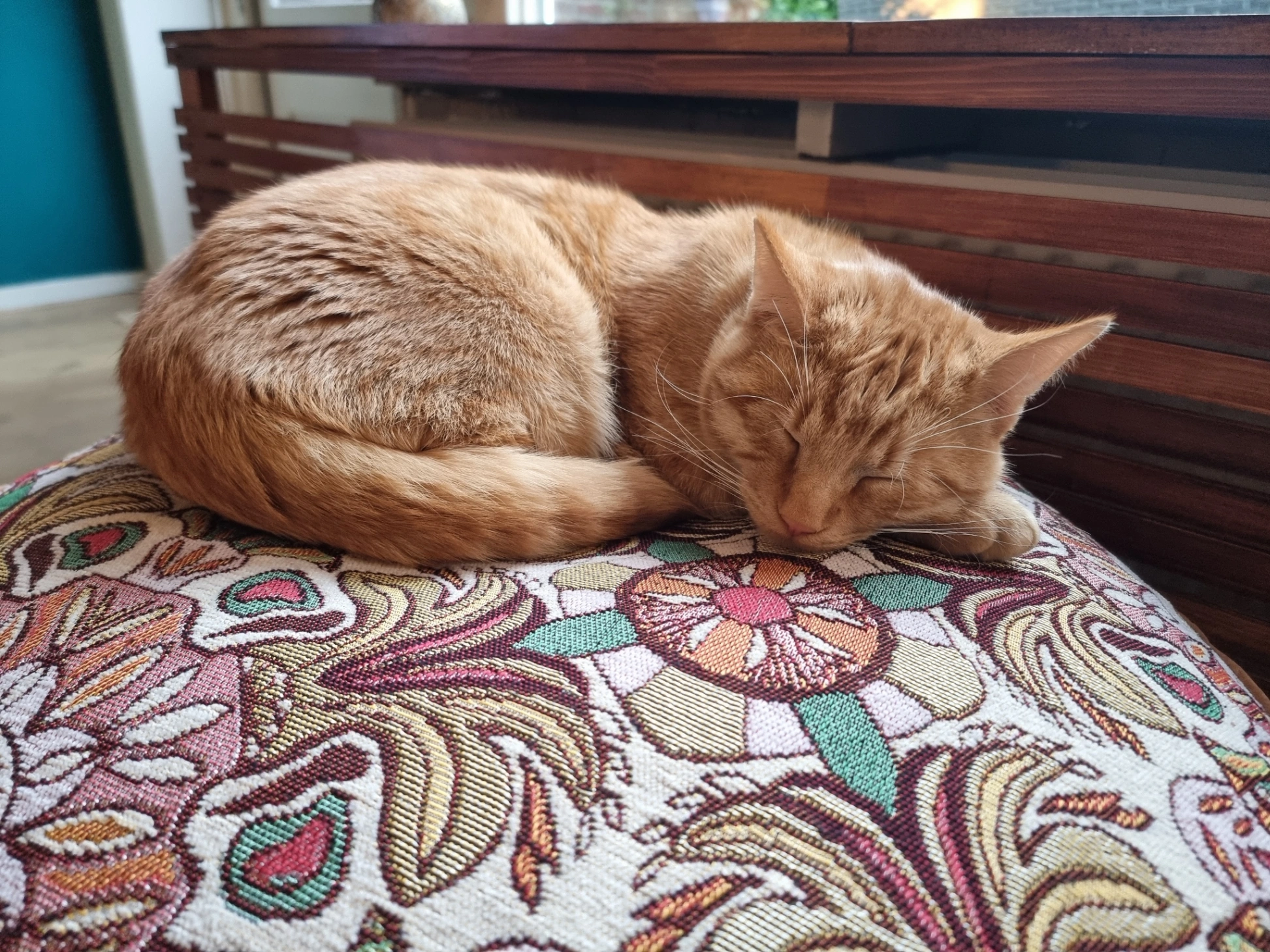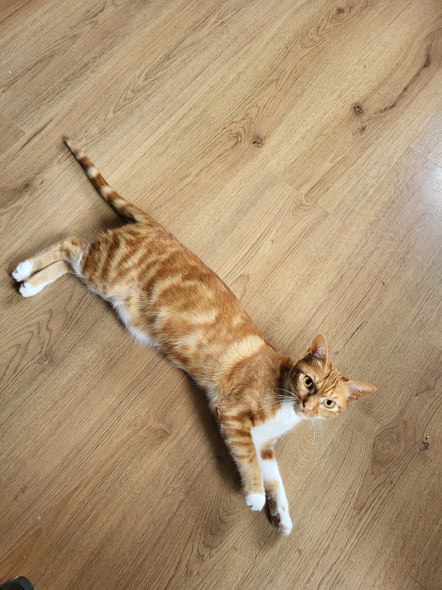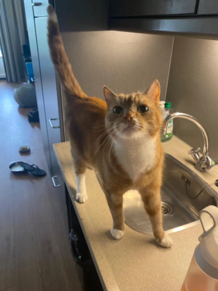 Peach is een kleine dames kat van bijna 2 jaar oud. Peach is erg schuw voor mensen, samen met haar broertje komt ze vanuit het asiel. Peach heeft een spitsig snoetje en een hoog mauwtje. Ook haar grommen naar anderen, klinkt hoger dan bij de meesten katten. Ook heeft ze een dun klein staartje, waardoor het lijkt dat ze haar evenwicht niet altijd even goed kan houden. Wel erg scherpe nagels en houdt van jagen en lekker eten