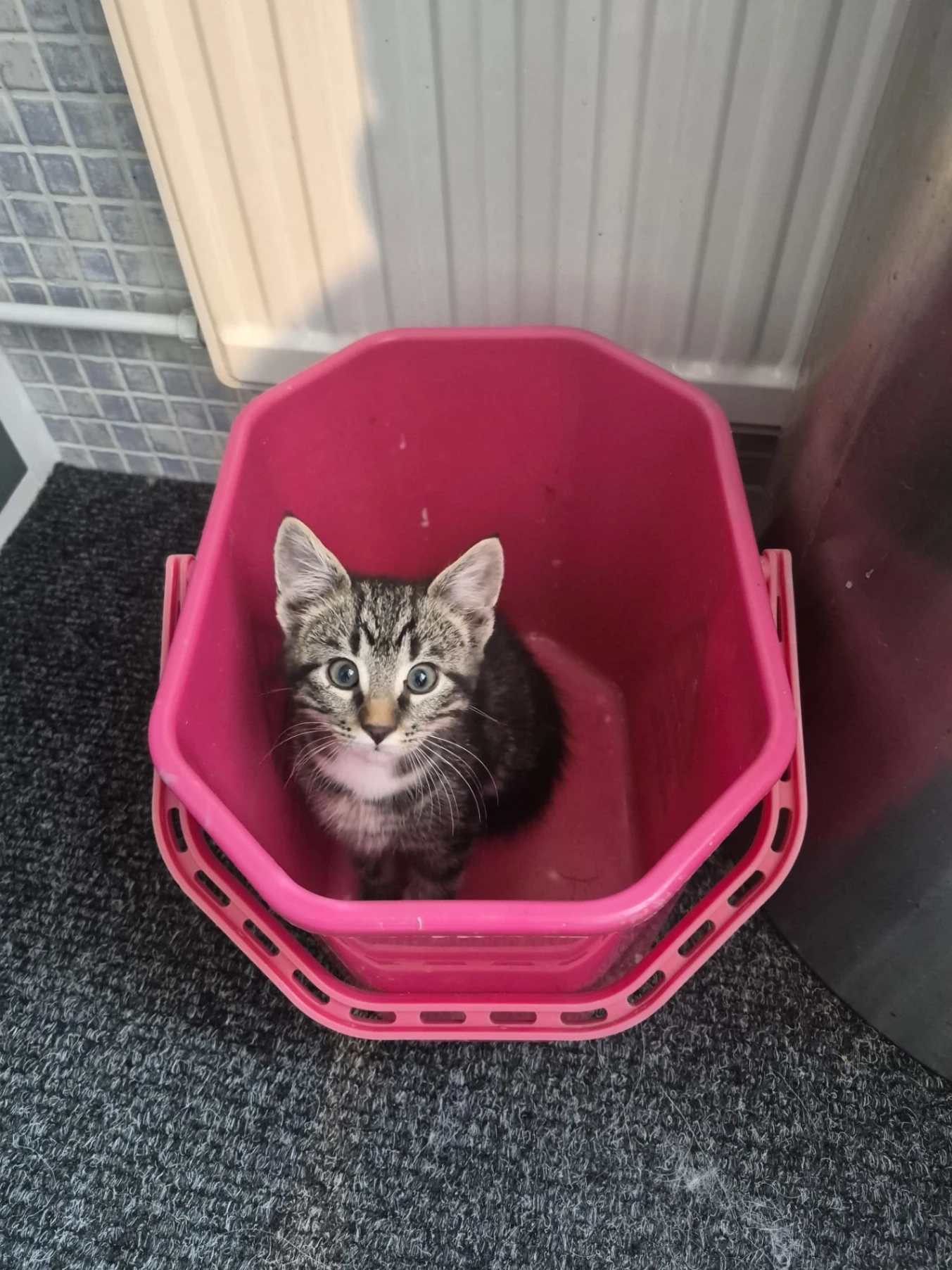 Kitten 4 maanden. Heeft een bruin neusje, witte snorharen, zwarte teentjes. Is heel speels en aanhankelijk