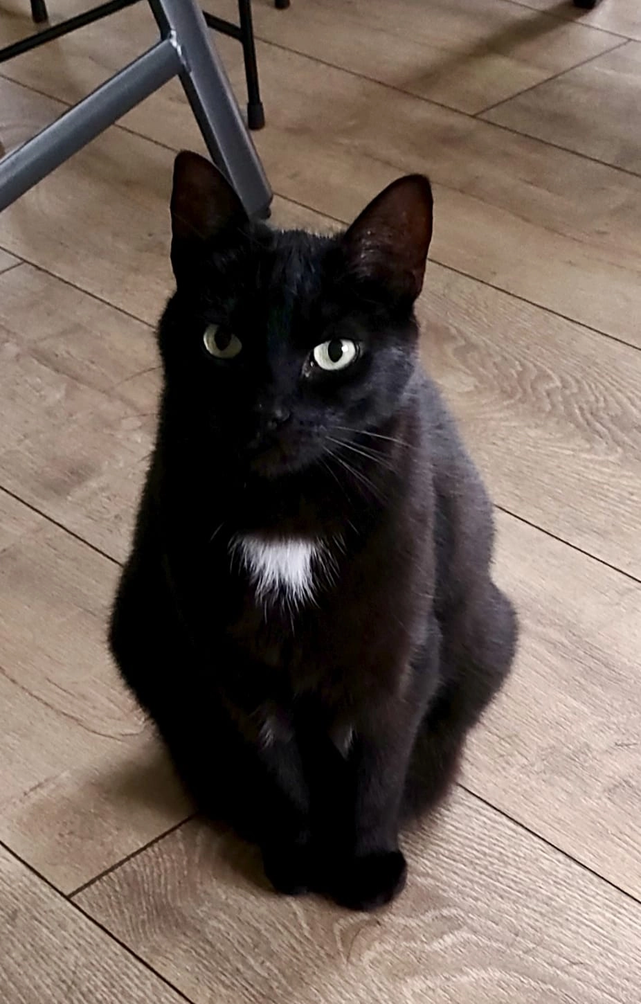 Zwart katje, met een wit vlekje op de borst, een hangbuik en met een grijs vlooienbandje. Reageert vermoedelijk schichtig op onverwachte bewegingen