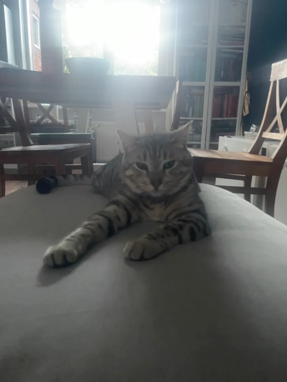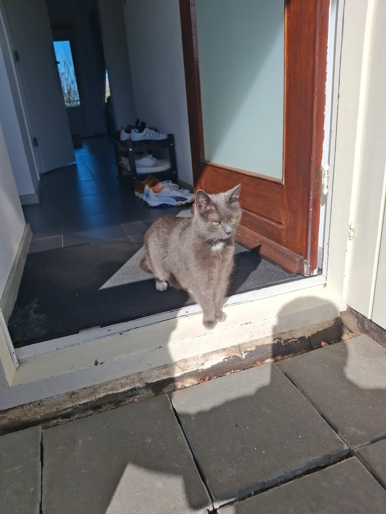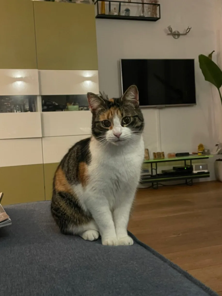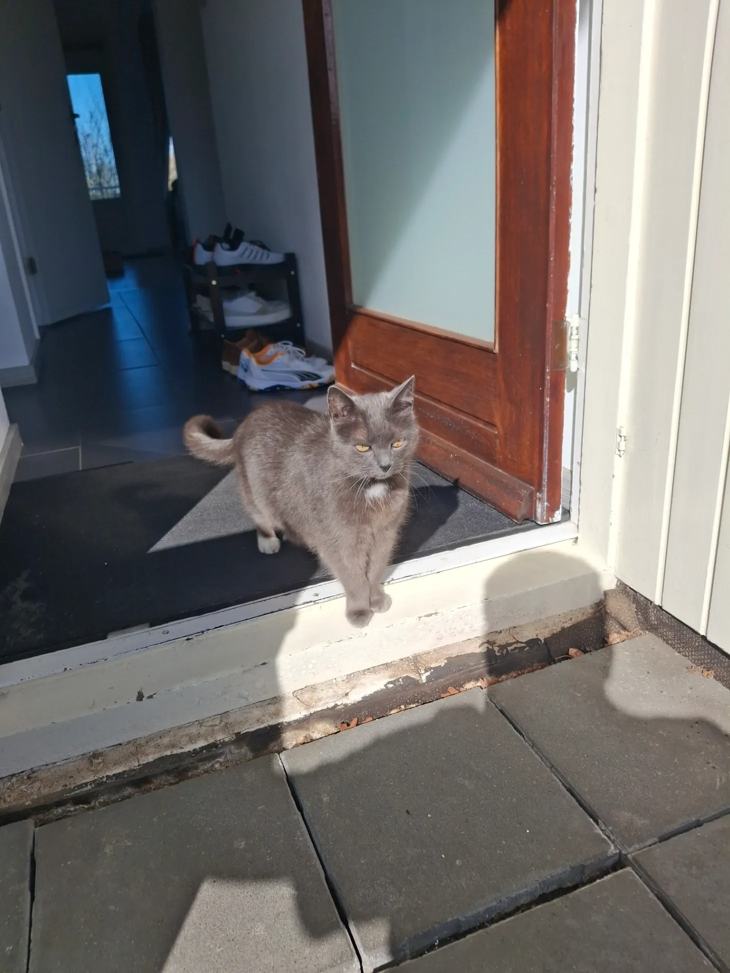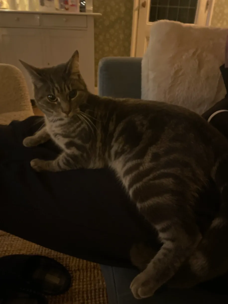 Grijze kat met witte sokken en een witte stip op haar nek. Is bang voor herrie en vreemden.
