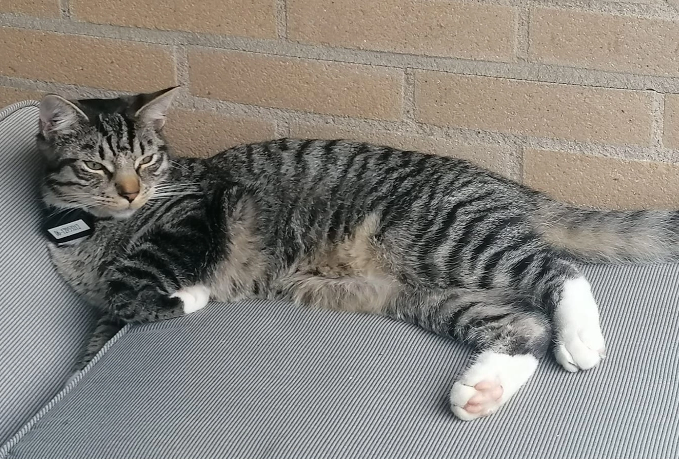 Toon heeft een witte bef, heeft wit op de buik en alle vier zβn pootjes zijn wit.