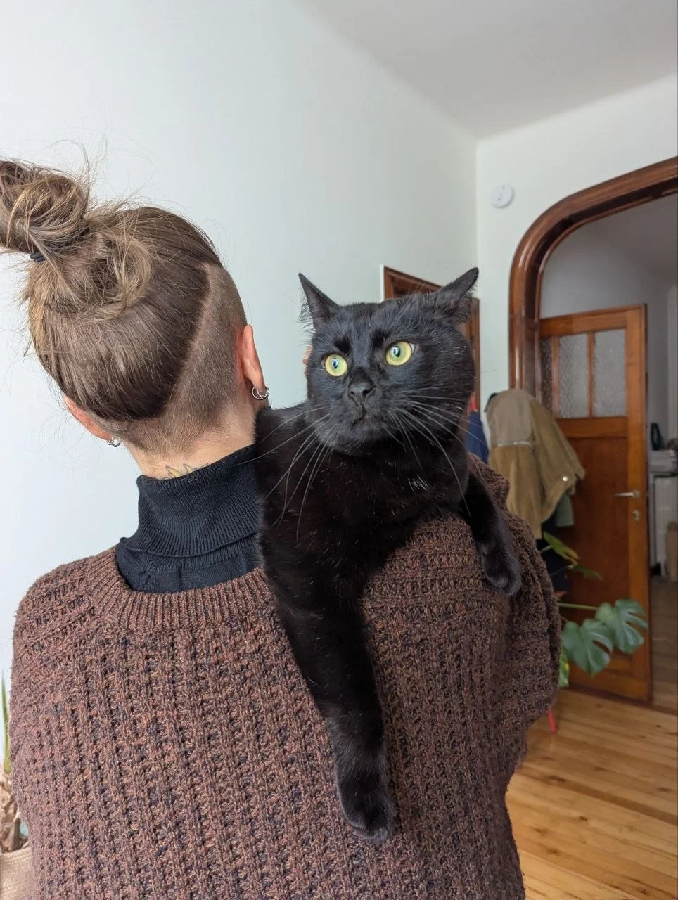 Chat européen, 3 ans, tout noir. Il est pucé et stérilisé. Généralement un gros miauleur. Il adore manger, mais il peut être un peu craintif. Contact : [email protected] ; +32 456 570 584