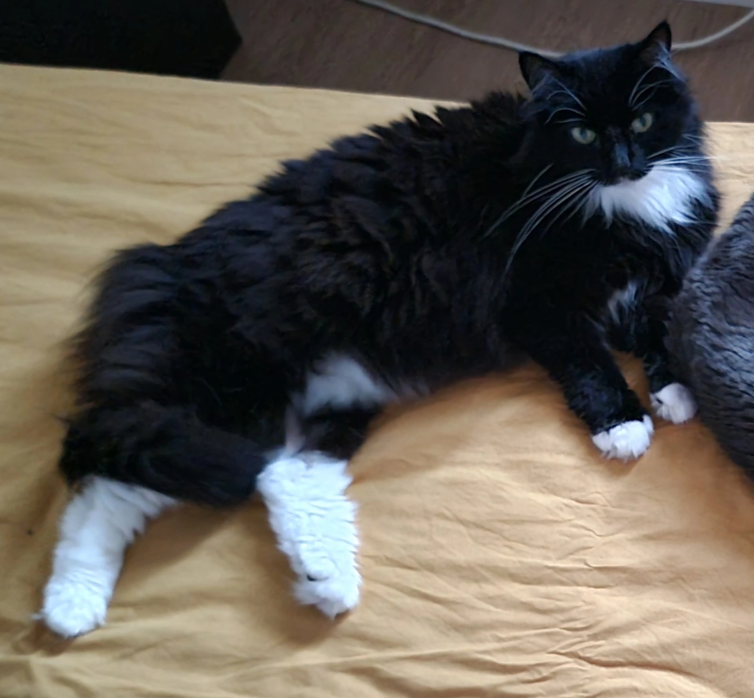 Chat mâle noir et blanc (tuxedo), poils mi-long, longues moustaches blanches.