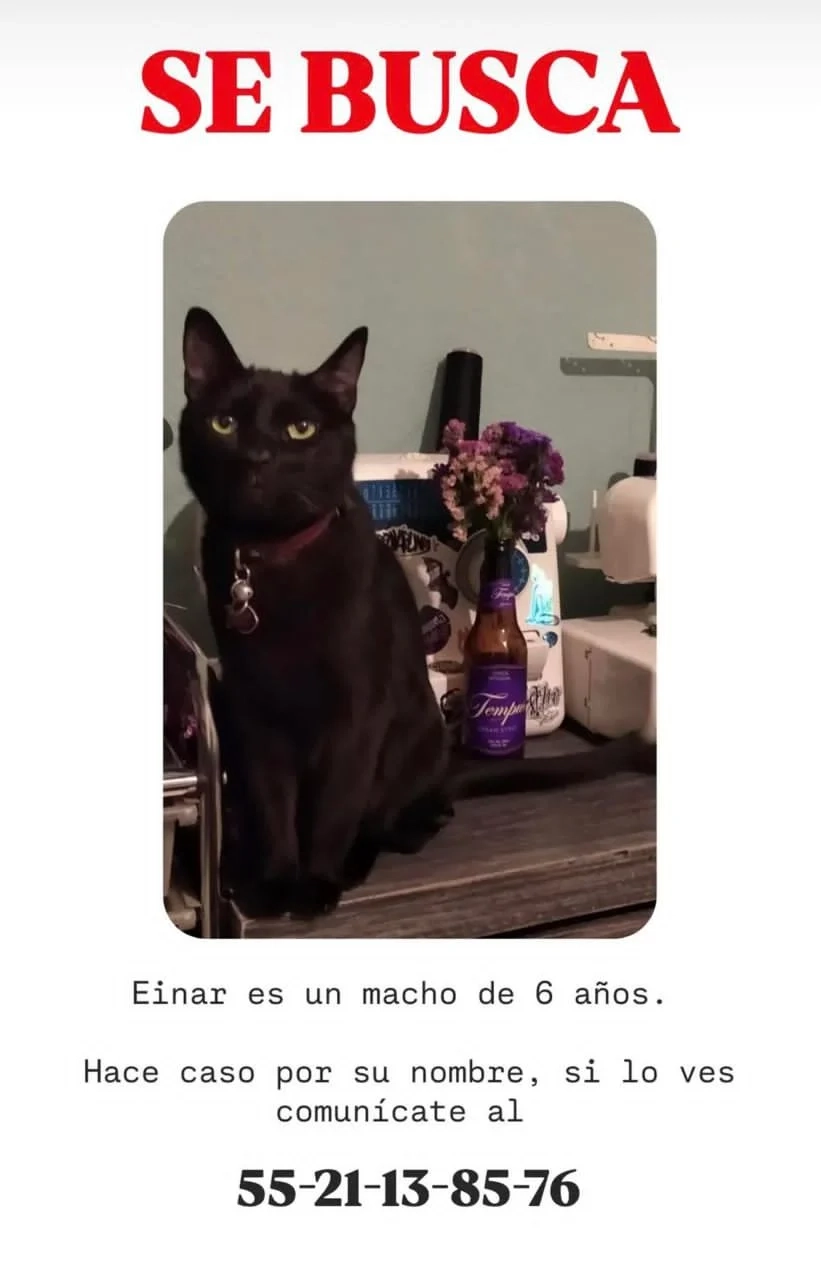 Macho de 6 años, completamente negro, trae collar rojo y placa con su nombre y el teléfono de contacto. Fue visto la última vez el domingo 18 de enero de 2026, entre las calles de Muralistas y Cubistas, colonia Nueva Rosita