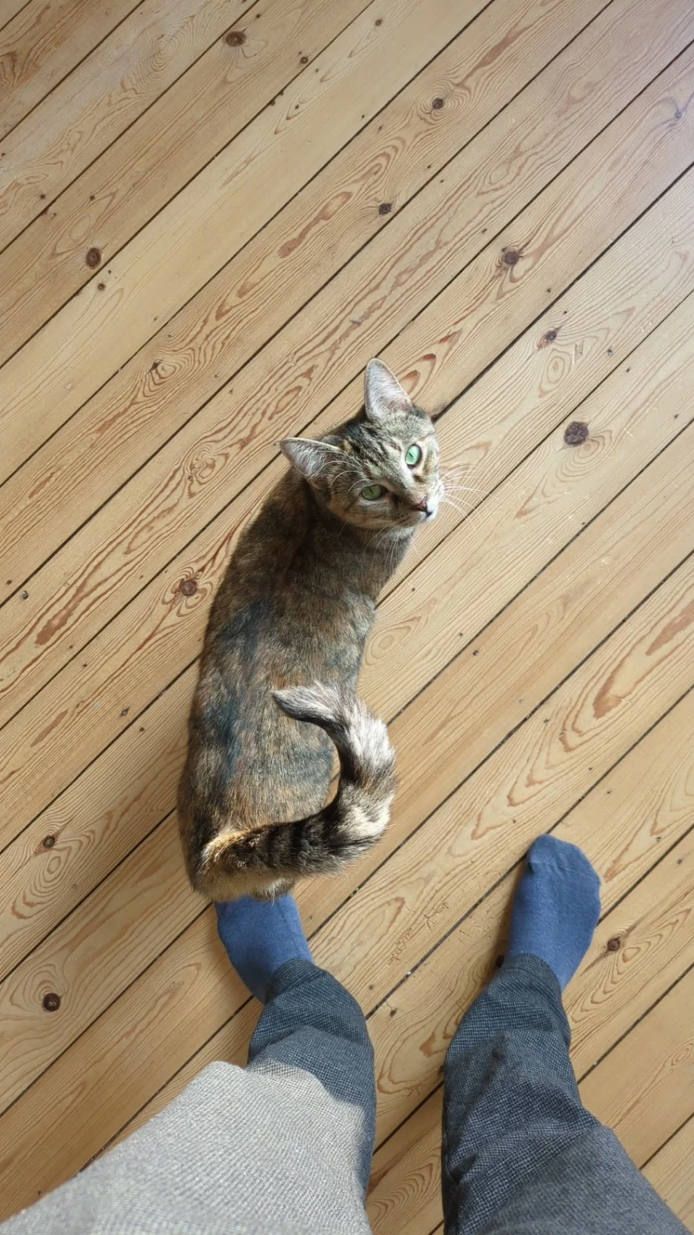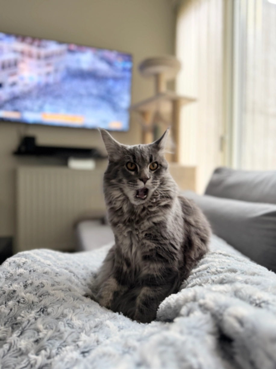 Chica heeft een enorm grote lange staart met grote oren en een klein gezichtje. Ze is nog een kitten en geen volwassen kat