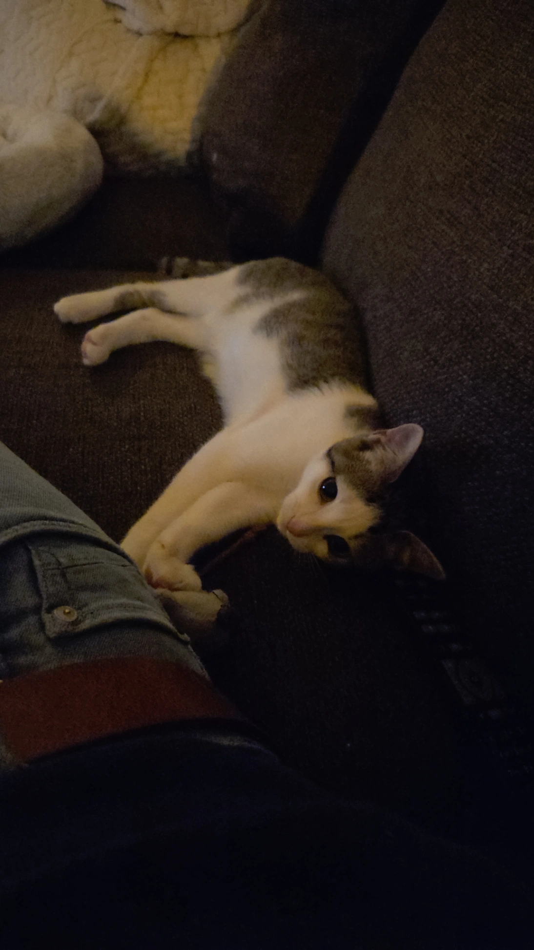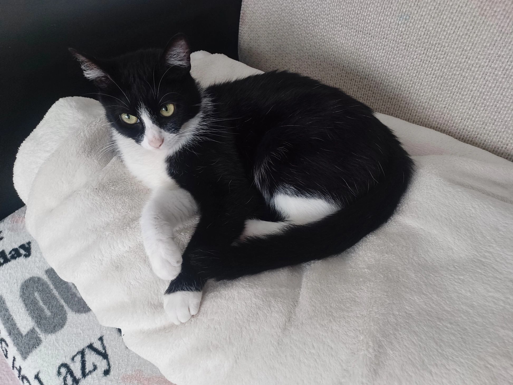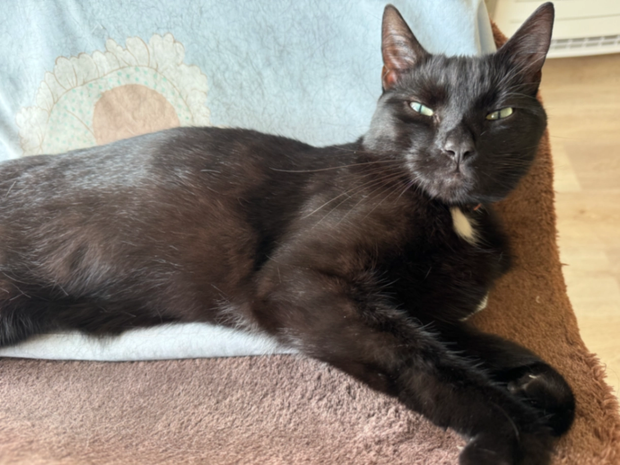 Een kleine zwarte kat met een wit plekje op zijn borst in de vorm van een hartje