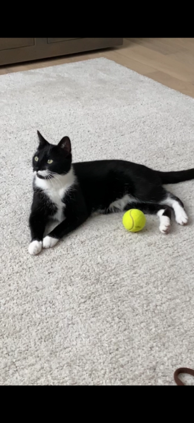 Zwarte, slanke kater. Witte borst, buik en snor. Lief en zachtaardig