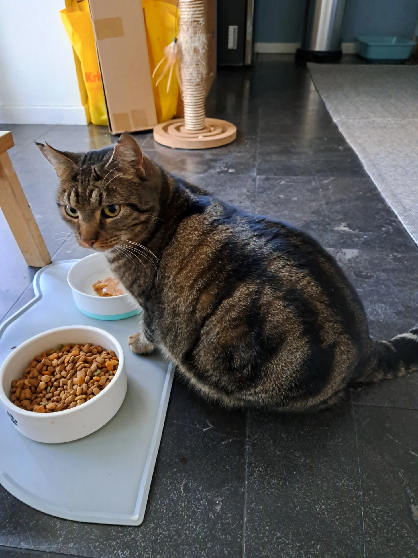 Een volledig grijze, gecastreerde kater met gele ogen. ongeveer drie jaar oud