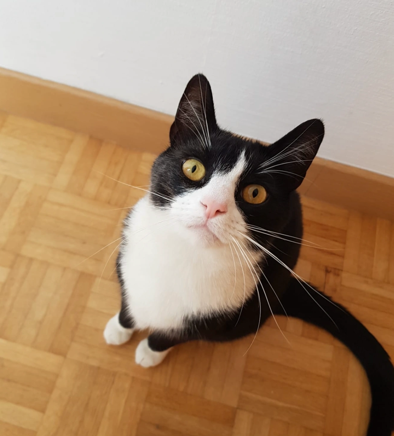 9 jaar oude kater. Volledig zwarte rug met een witte buik, borst en twee witte achterpoten met zwarte vlek.