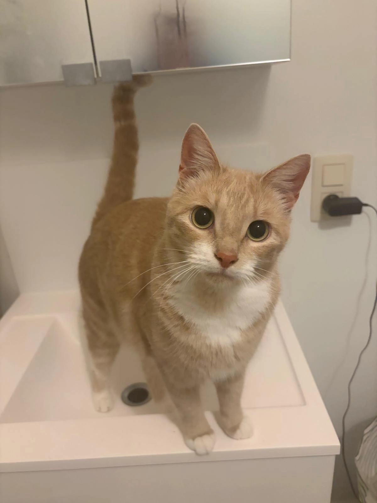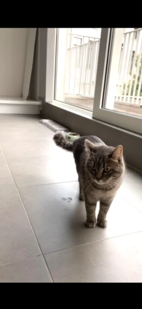 Tijgerkat met witte sokjes. Hij kan heel luid en hoog miauwen. Lieve zachte kater.
